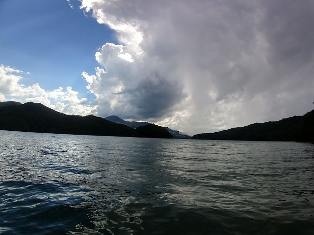 The weather forecast called for afternoon thunderstorms every day, somewhat standard for the beginning of September. We had a little bit of rain as we got close to the lake, but not too bad. We got to the boat ramp and got set up and launched at about 3pm with lots of clouds in the sky. About 5 minutes of paddling and the sky opened up on us with lots of wind/rain and some thunder. Thankfully the wind/rain was at our backs and after about 20 minutes of paddling we were out of the rain and not hearing thunder, but there was a stretch where I was questioning my judgement and wondering if we should head back to the ramp.