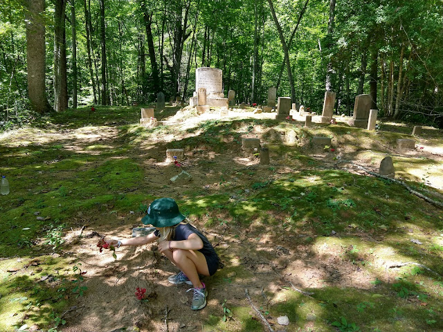 The next morning I slept in a bit and then got up to read and leave her sleeping. She ended up sleeping until 9am. After a bit, we got back on the water. I had the idea of paddling a bit and then hiking to check out a couple of the old cemeteries. So, we paddled for about an hour and a half over to where Pilkey Creek drains into the lake. I had passed this way in March on the Lakeshore Trail, so I knew there was a road/path from the lake. We swam in the lake to cool off and then had lunch and then hiked about a mile up to Pilkey and Posey Cemeteries.