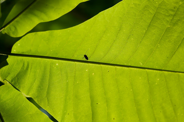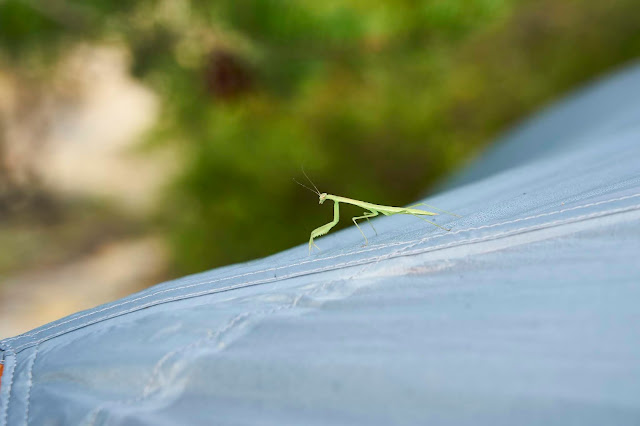 While packing up the tent, we found a small praying mantis which he thought was pretty cool.