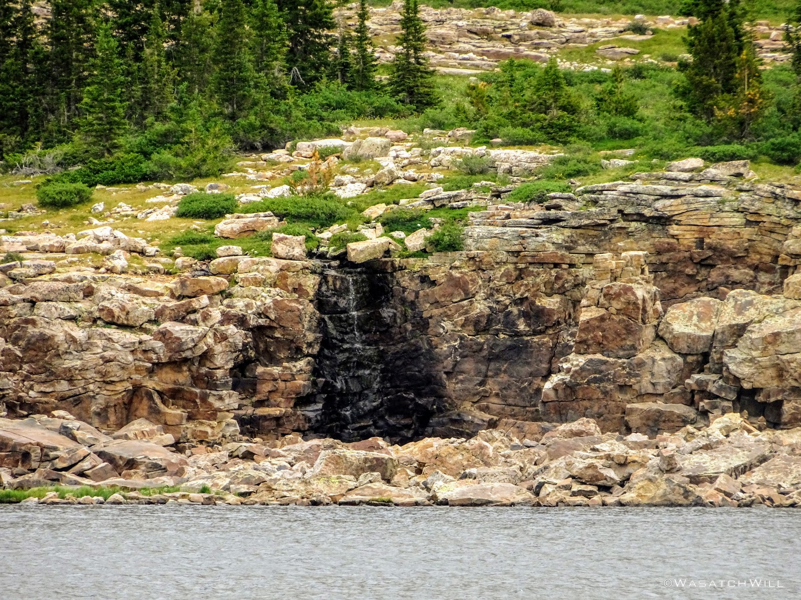 Once past Morat Lakes, we'd not see much of anyone else again until we rounded back around to Jordan Lake, save one or two people out exploring along the high bench. To get up onto that bench though required a hefty push up a steep slope riddled with loose dirt and rocks alongside a waterfall, now much more meager than I had last seen it.