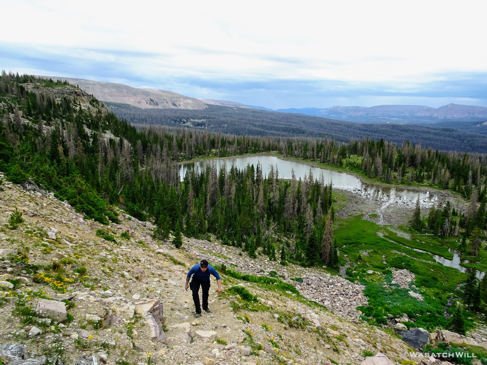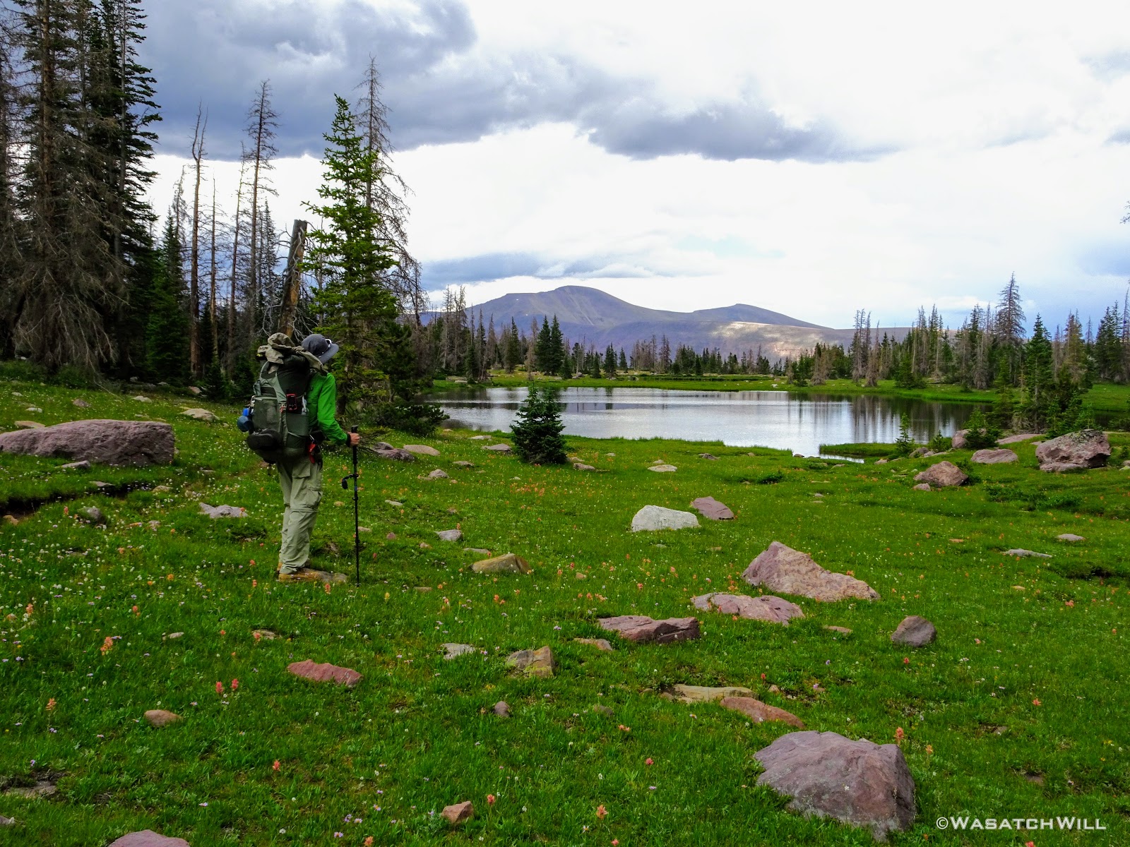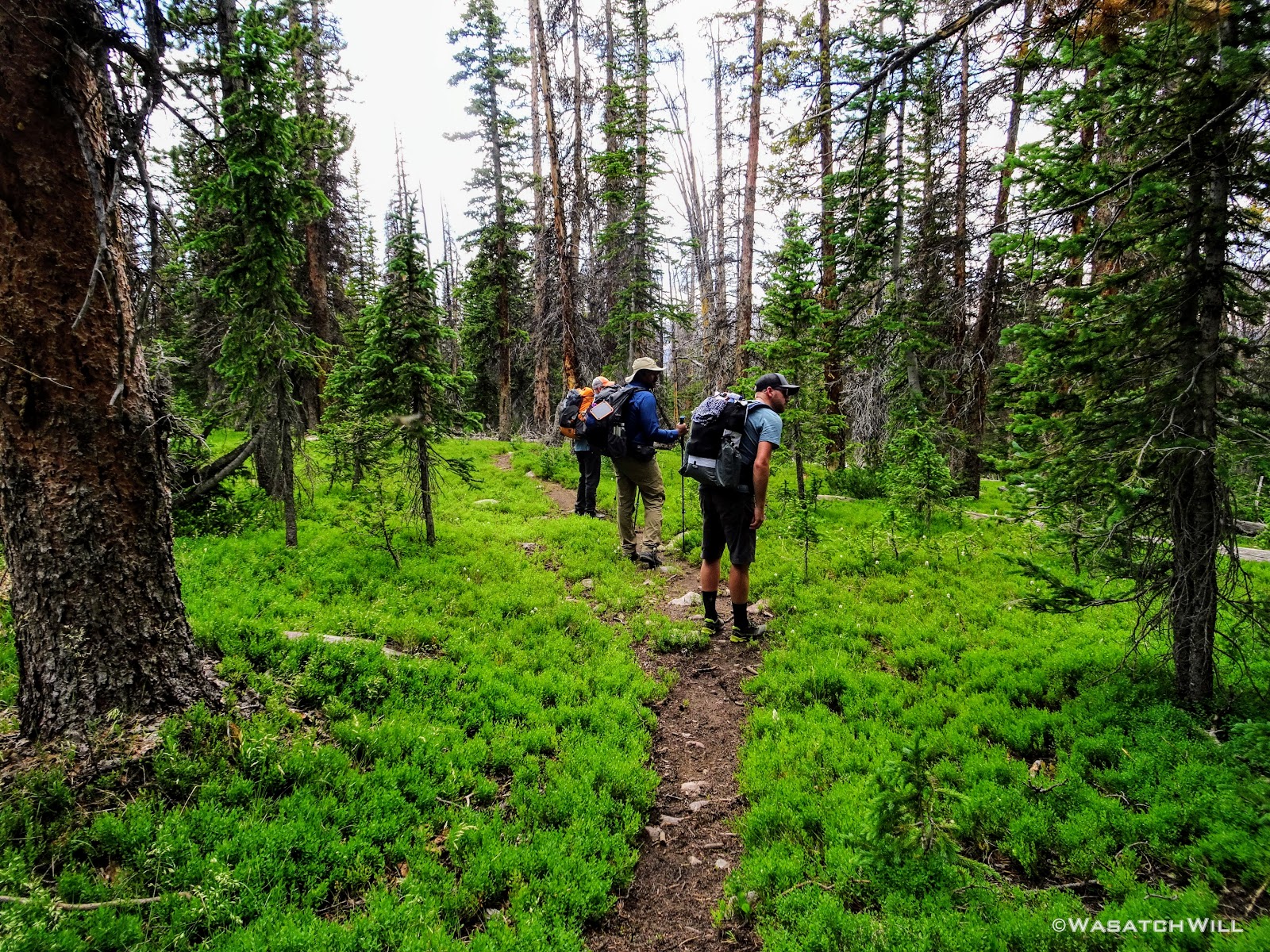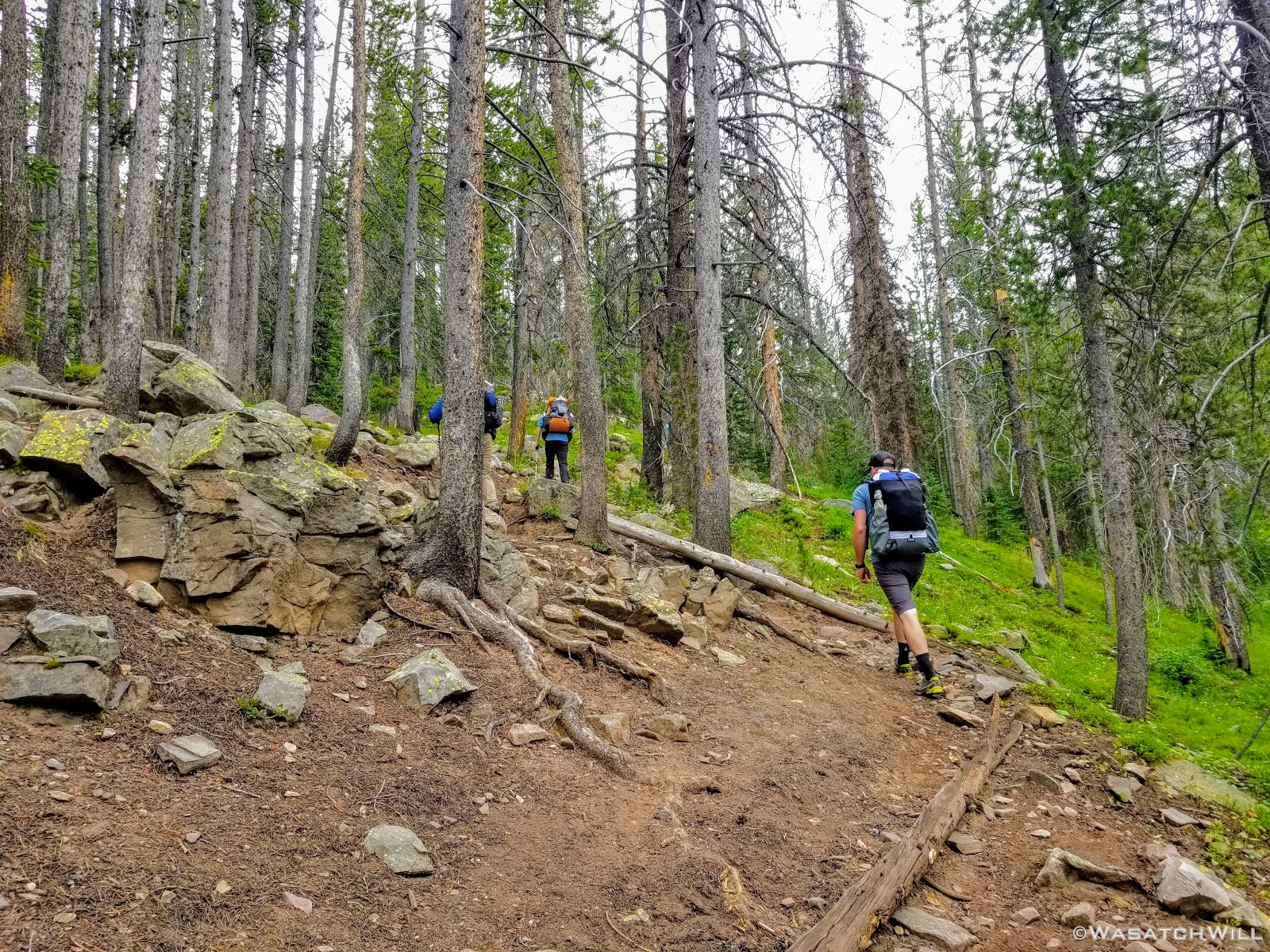 As we approached the lakes, we got showered on a bit with some light rain and hail, but it didn't stick around long. Once we arrived at Brinkley Lake we began to scout around for a suitable site. Three of us had brought hammocks and two of us had brought tents. Unfortunately, many sections of the Uintas have had their trees devastated by a beetle infestation over the years and this was one of those areas. It proved too difficult to find a spot nearby with enough healthy trees in safe spots (sans widow-makers) for 3 different hammocks to be hung in close proximity.