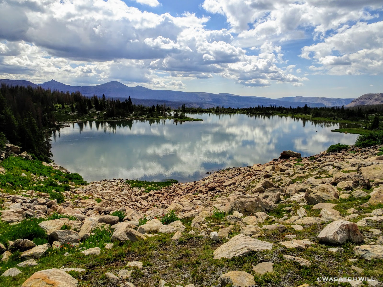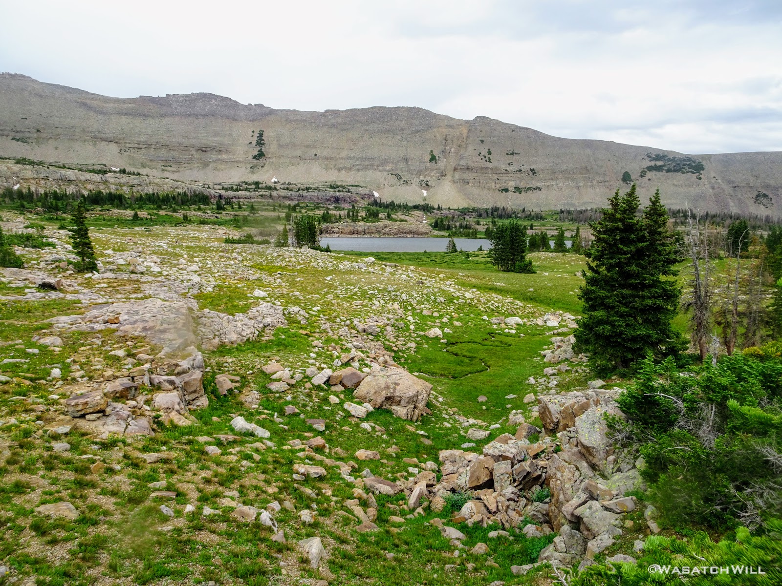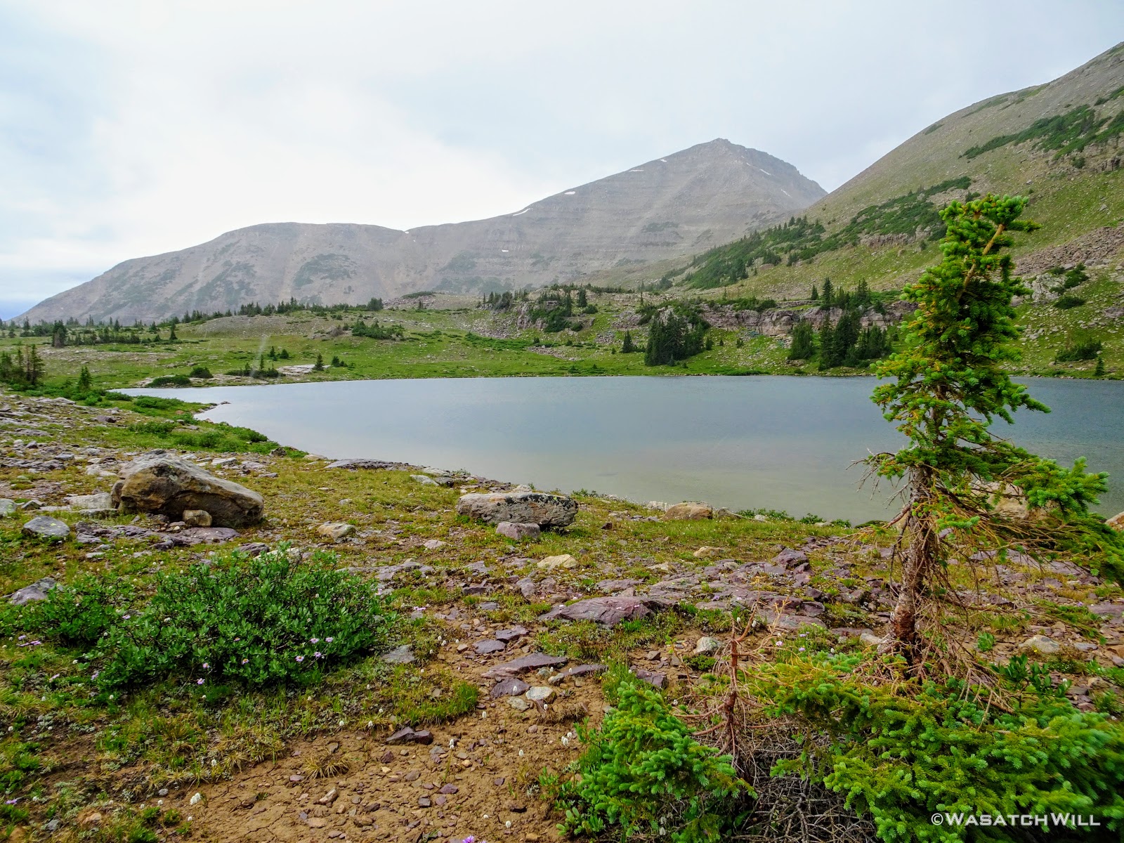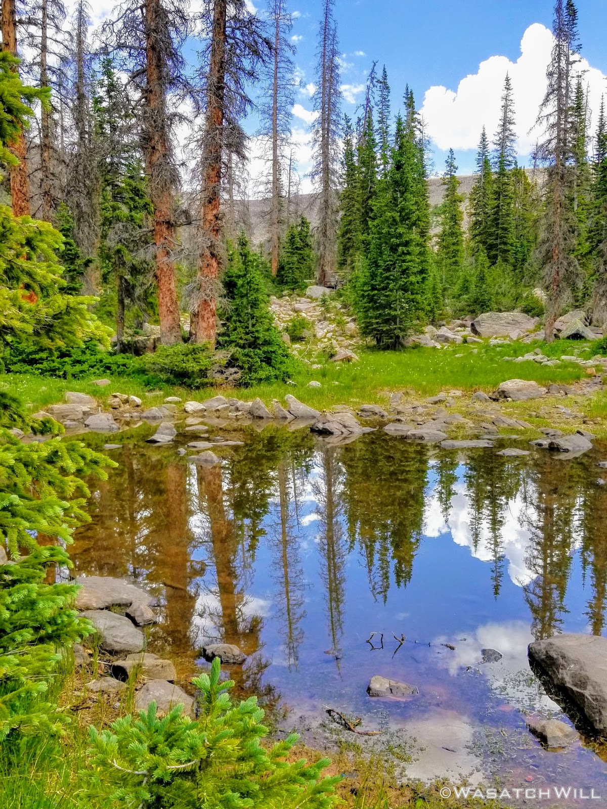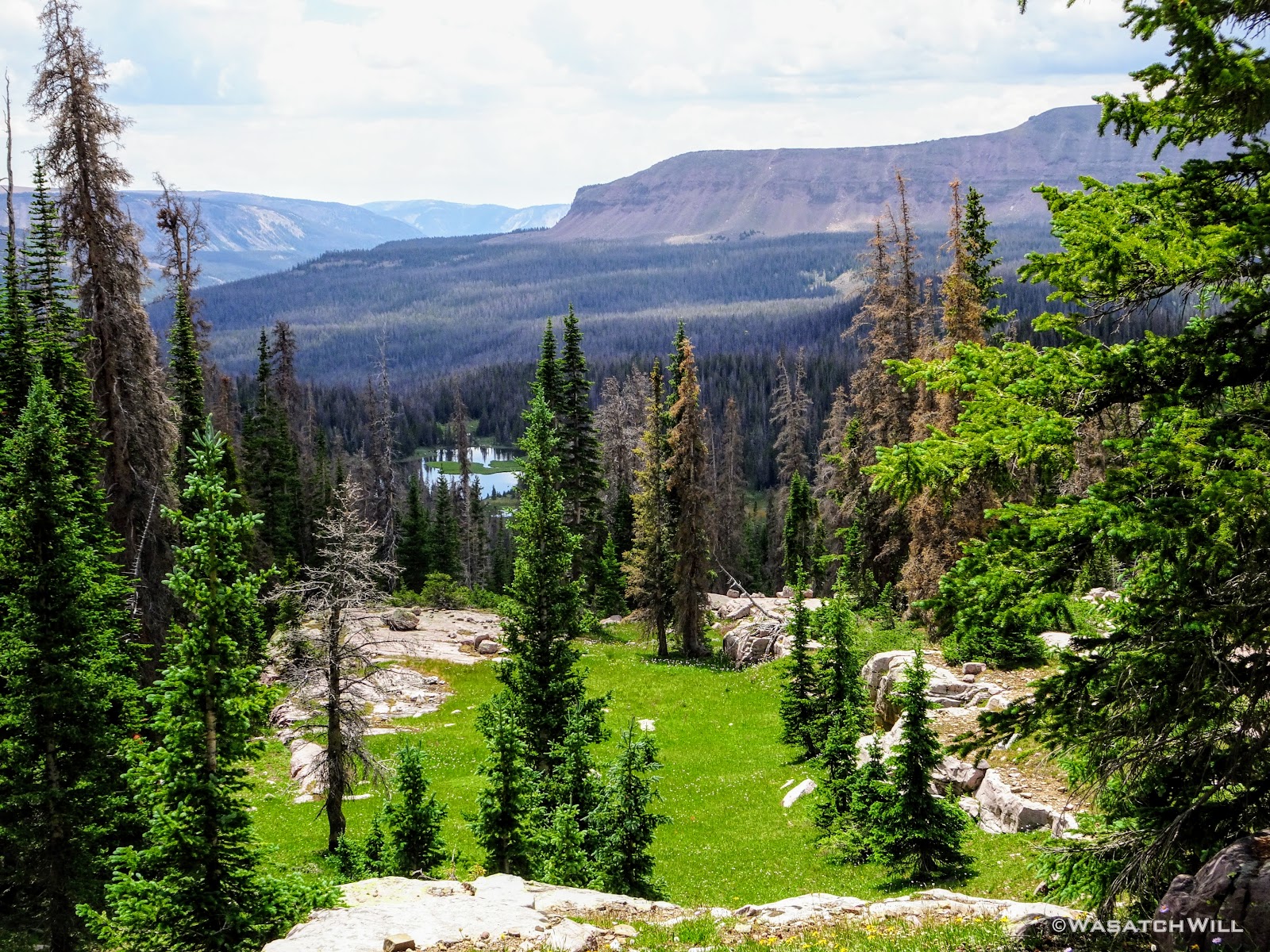 As we approached the lakes, we got showered on a bit with some light rain and hail, but it didn't stick around long. Once we arrived at Brinkley Lake we began to scout around for a suitable site. Three of us had brought hammocks and two of us had brought tents. Unfortunately, many sections of the Uintas have had their trees devastated by a beetle infestation over the years and this was one of those areas. It proved too difficult to find a spot nearby with enough healthy trees in safe spots (sans widow-makers) for 3 different hammocks to be hung in close proximity.