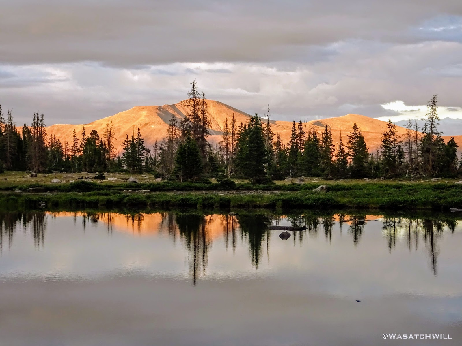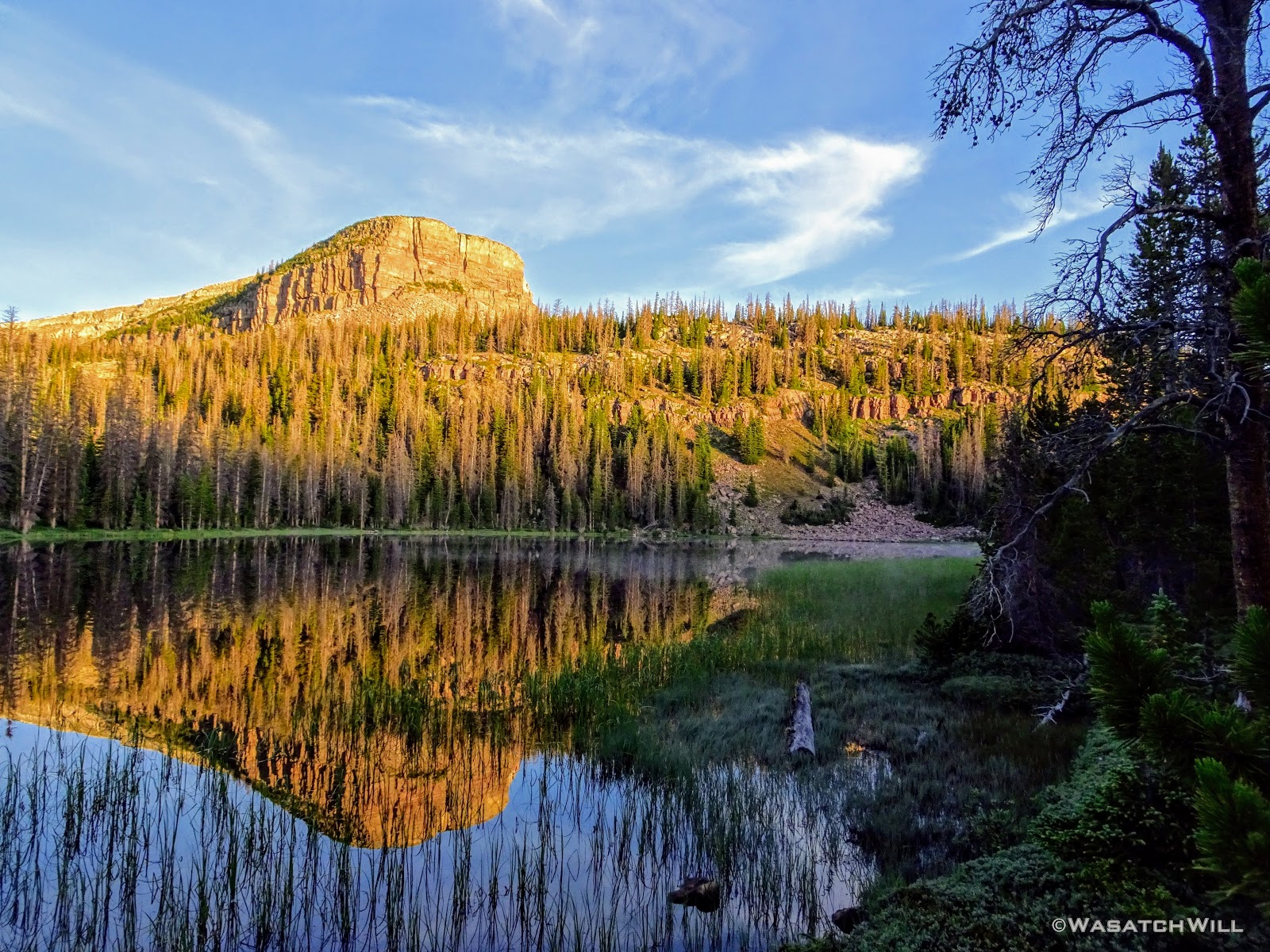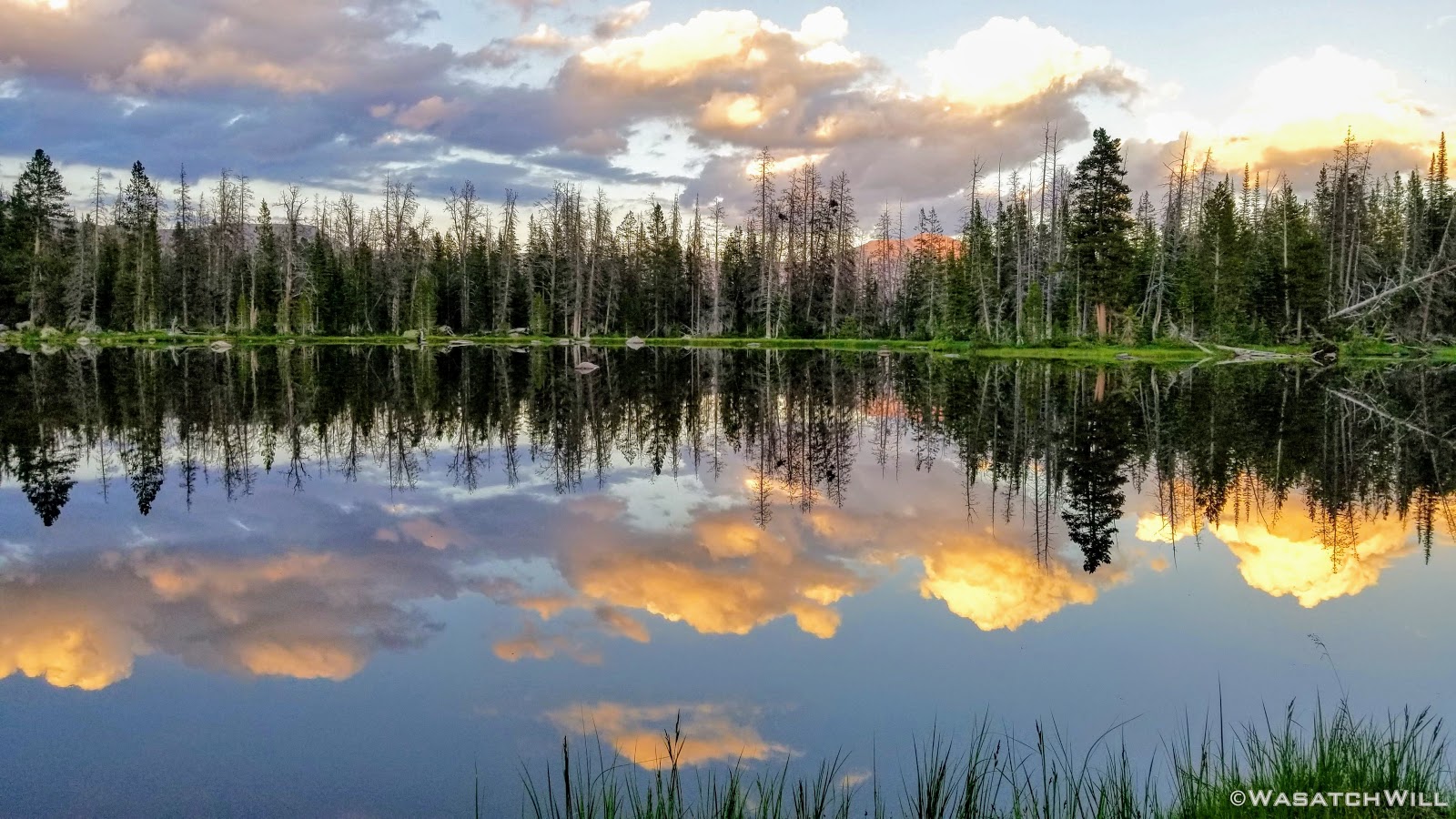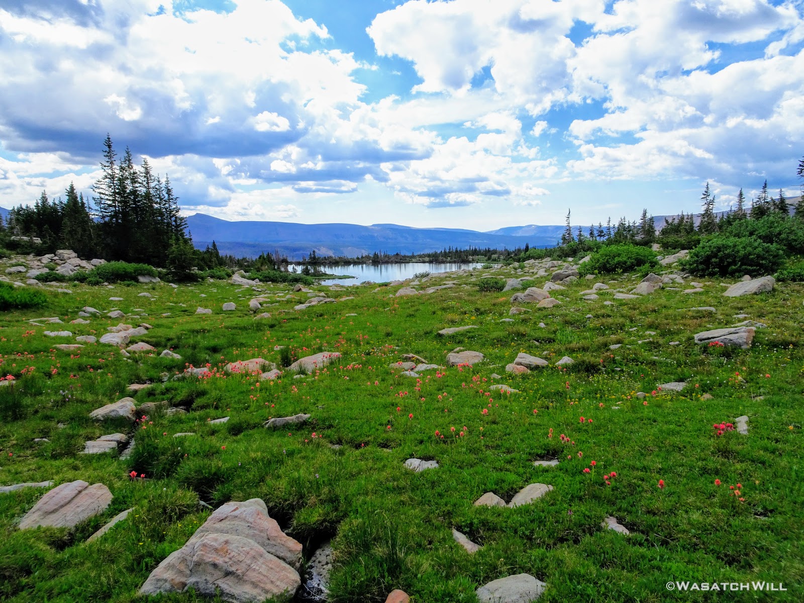 As we approached the lakes, we got showered on a bit with some light rain and hail, but it didn't stick around long. Once we arrived at Brinkley Lake we began to scout around for a suitable site. Three of us had brought hammocks and two of us had brought tents. Unfortunately, many sections of the Uintas have had their trees devastated by a beetle infestation over the years and this was one of those areas. It proved too difficult to find a spot nearby with enough healthy trees in safe spots (sans widow-makers) for 3 different hammocks to be hung in close proximity.