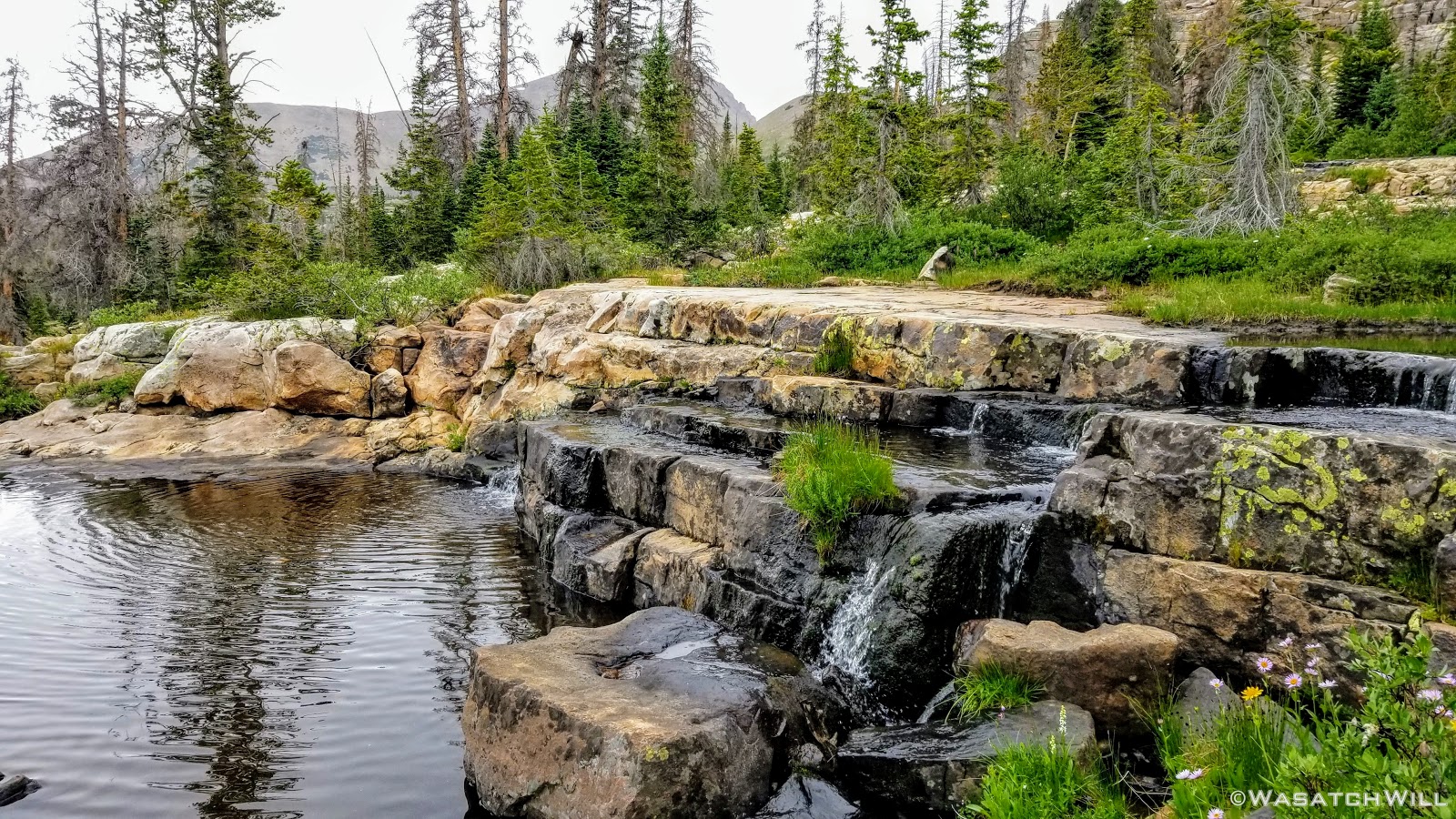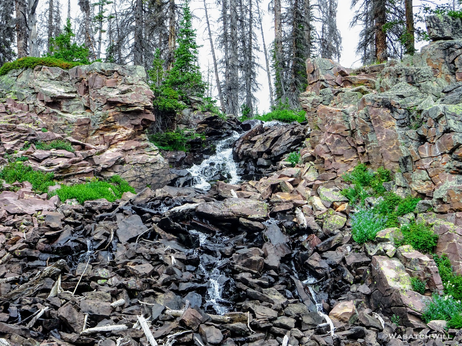 All geared up, we were able to hit the trail by mid-afternoon. The first couple miles ran parallel with the Duchesne River through dense forest leaving little for views. But occasionally we'd find ourselves passing by some nice little picturesque spots including a nice little unexpected waterfall.