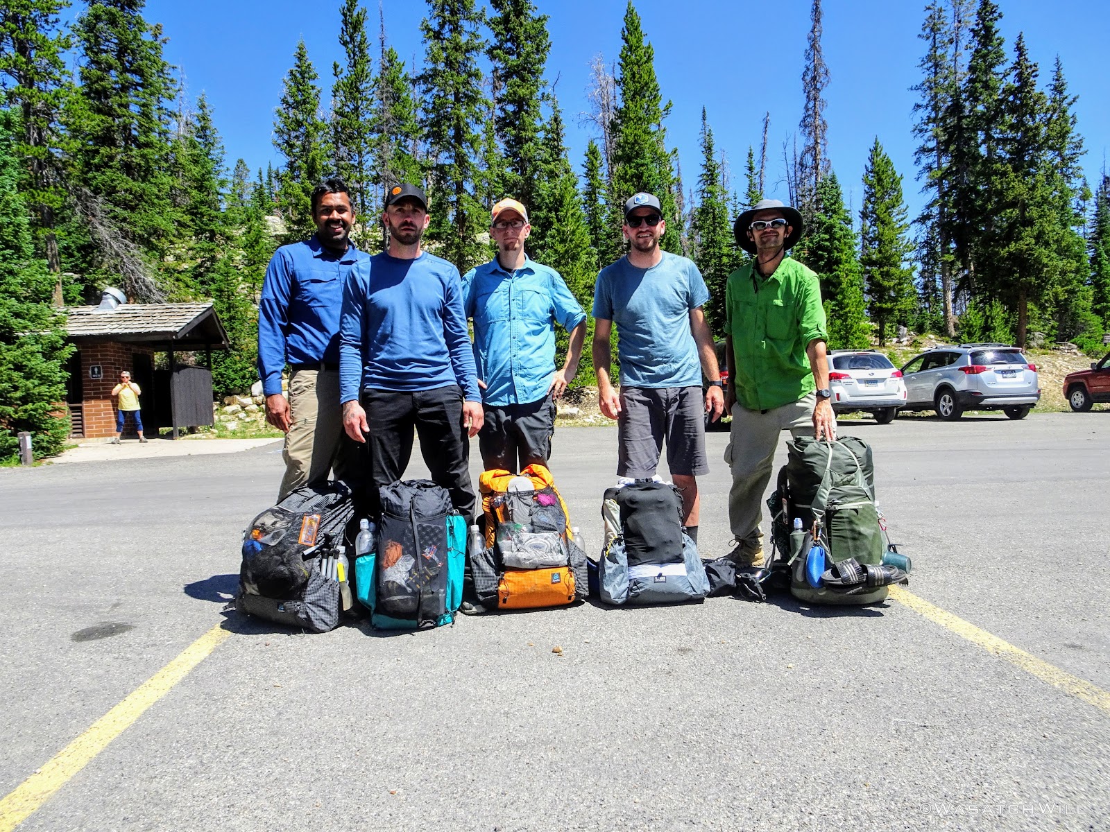 After making a short drive over to pick me up at my home, Devin and I drove on up to SLC to pick up the three Ohio amigos. Once all packed like sardines into Devin's Jeep Compass, the camaraderie was instant. We fueled up both the car at a gas station and our bodies at Crown Burger. We then made the drive up through Parley's Canyon, Park City, Kamas, and finally on up the Mirror Lake Highway where we'd ultimately pull into the Mirror Lake Trailhead lot to saddle up for the big trip ahead.