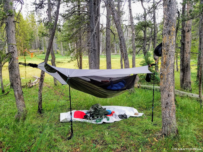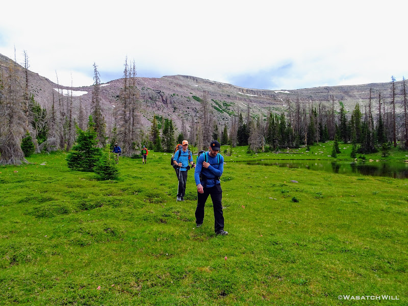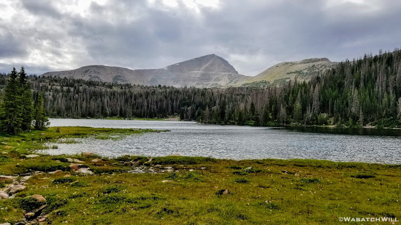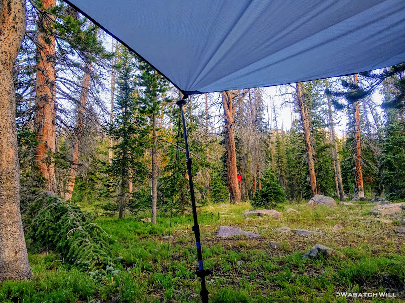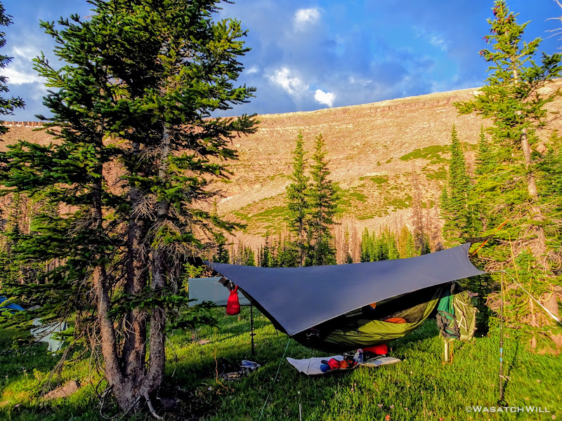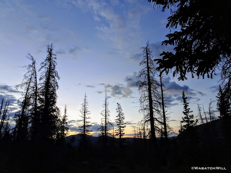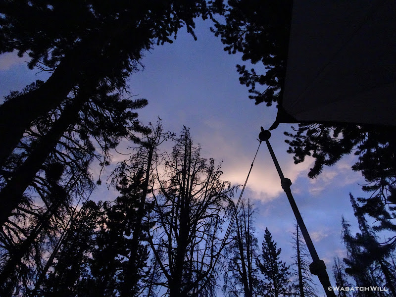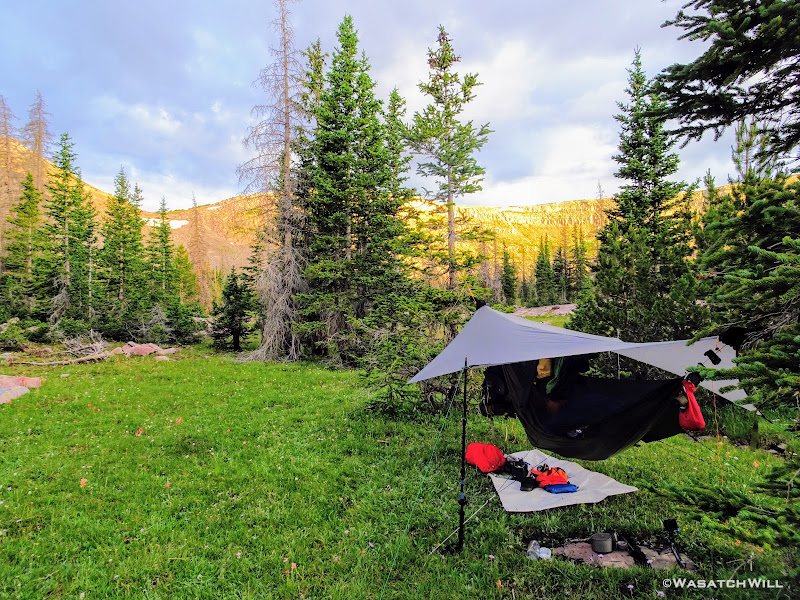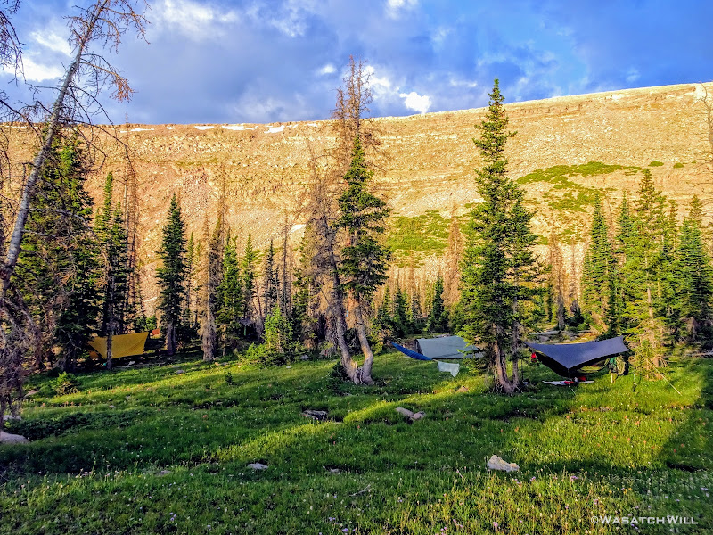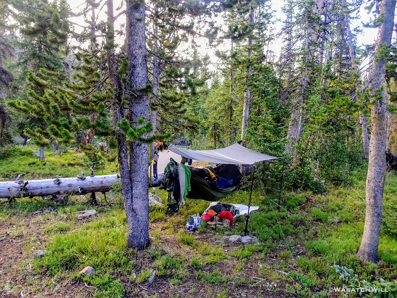 As we approached the lakes, we got showered on a bit with some light rain and hail, but it didn't stick around long. Once we arrived at Brinkley Lake we began to scout around for a suitable site. Three of us had brought hammocks and two of us had brought tents. Unfortunately, many sections of the Uintas have had their trees devastated by a beetle infestation over the years and this was one of those areas. It proved too difficult to find a spot nearby with enough healthy trees in safe spots (sans widow-makers) for 3 different hammocks to be hung in close proximity.