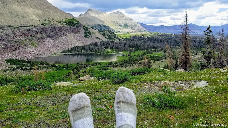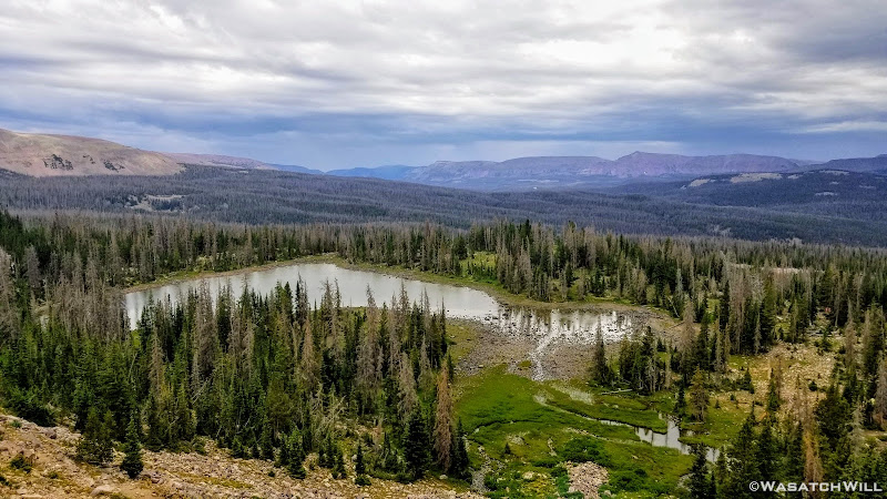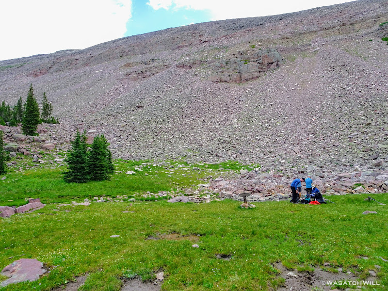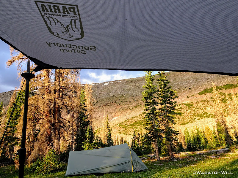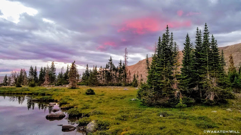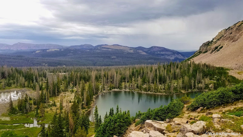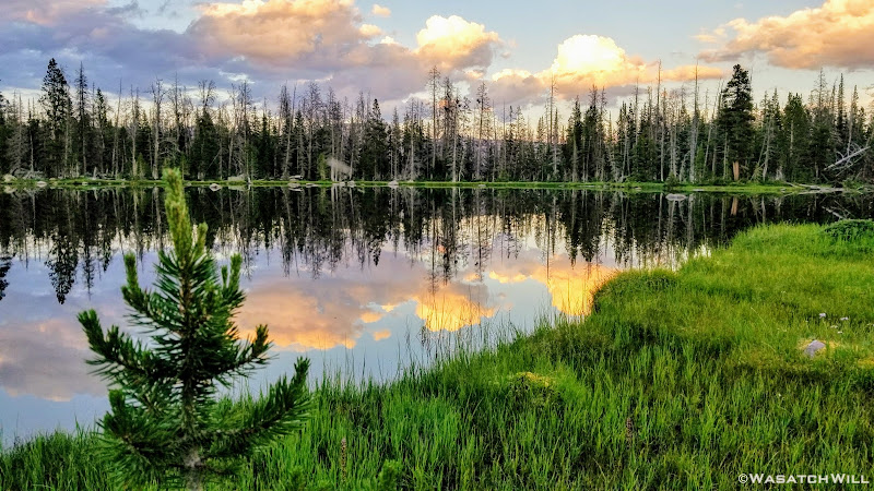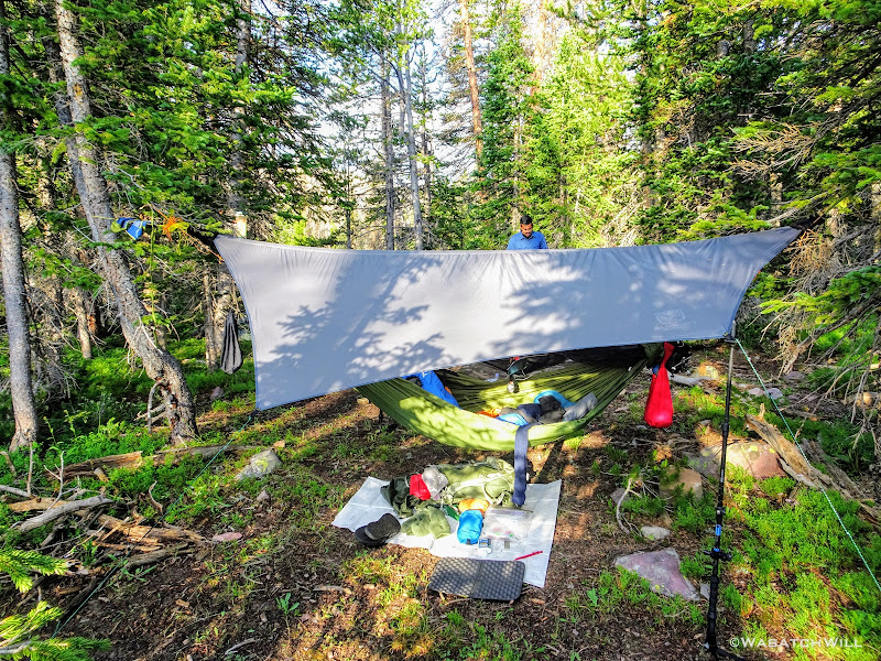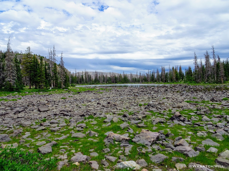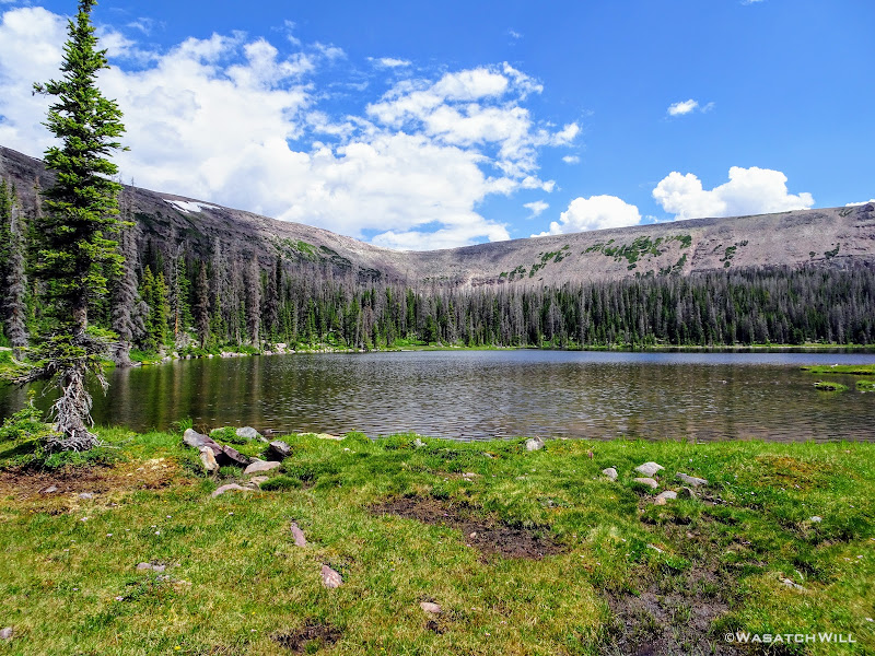 As we approached the lakes, we got showered on a bit with some light rain and hail, but it didn't stick around long. Once we arrived at Brinkley Lake we began to scout around for a suitable site. Three of us had brought hammocks and two of us had brought tents. Unfortunately, many sections of the Uintas have had their trees devastated by a beetle infestation over the years and this was one of those areas. It proved too difficult to find a spot nearby with enough healthy trees in safe spots (sans widow-makers) for 3 different hammocks to be hung in close proximity.