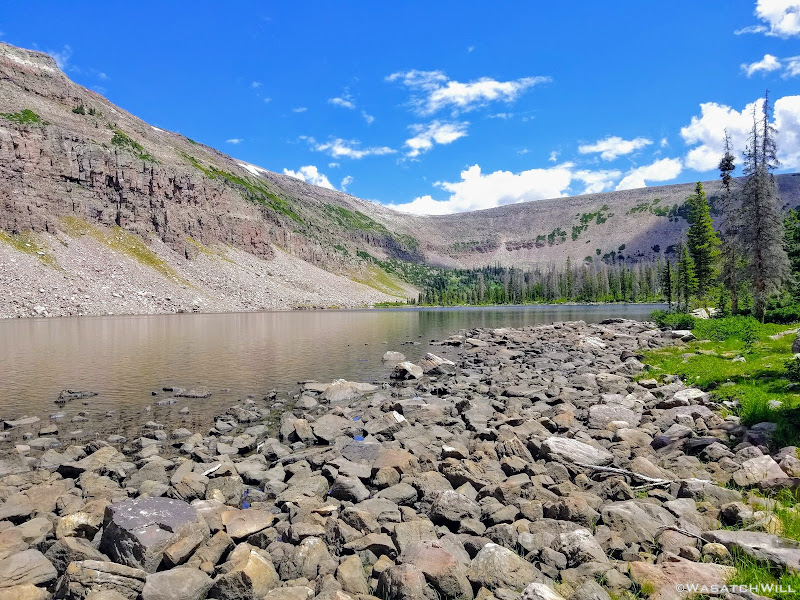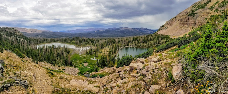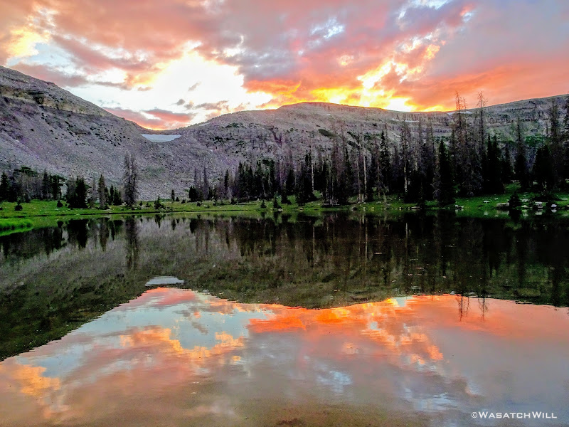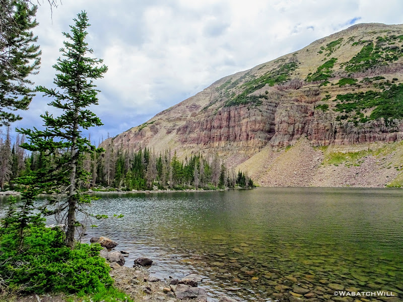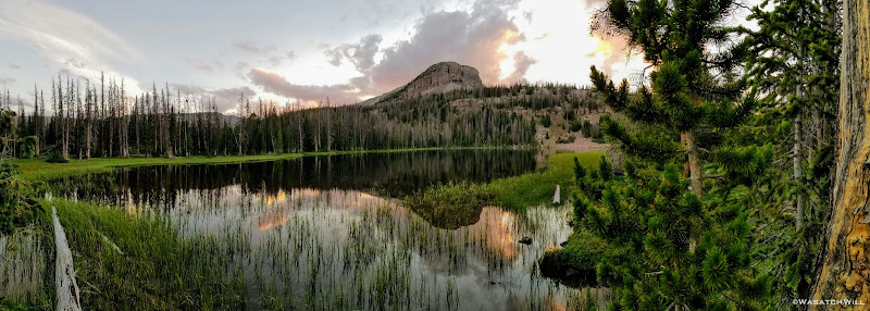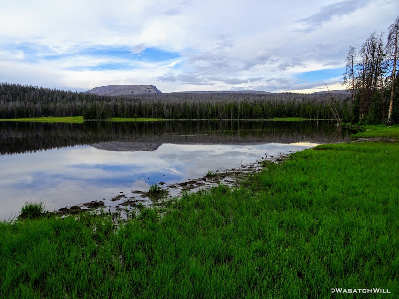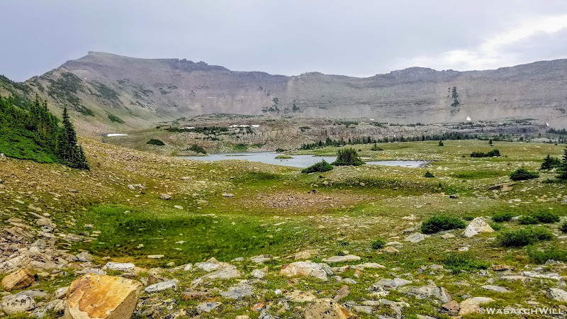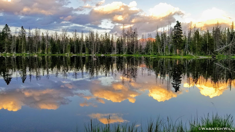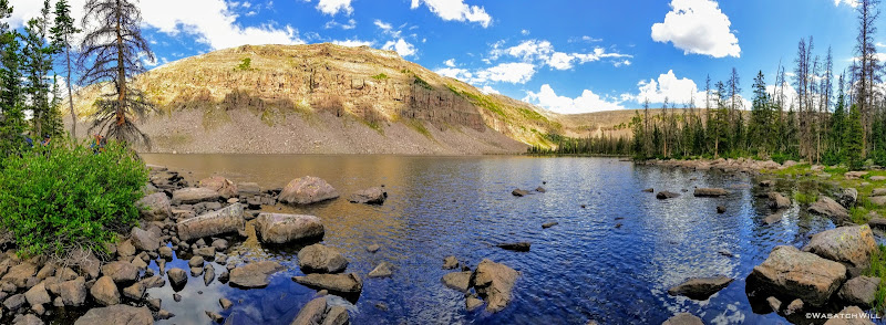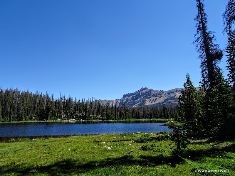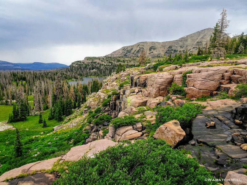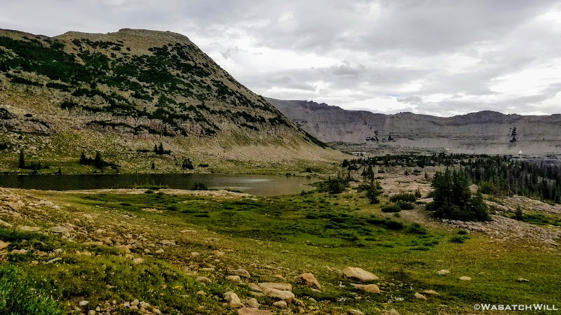 As we approached the lakes, we got showered on a bit with some light rain and hail, but it didn't stick around long. Once we arrived at Brinkley Lake we began to scout around for a suitable site. Three of us had brought hammocks and two of us had brought tents. Unfortunately, many sections of the Uintas have had their trees devastated by a beetle infestation over the years and this was one of those areas. It proved too difficult to find a spot nearby with enough healthy trees in safe spots (sans widow-makers) for 3 different hammocks to be hung in close proximity.