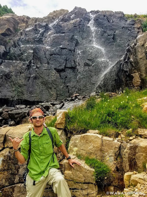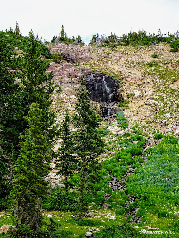 Once past Morat Lakes, we'd not see much of anyone else again until we rounded back around to Jordan Lake, save one or two people out exploring along the high bench. To get up onto that bench though required a hefty push up a steep slope riddled with loose dirt and rocks alongside a waterfall, now much more meager than I had last seen it.