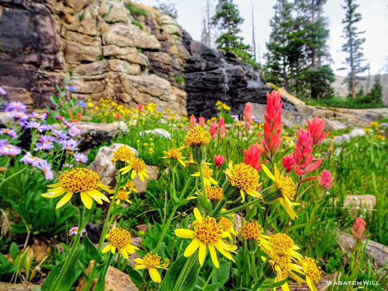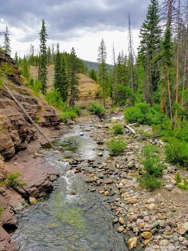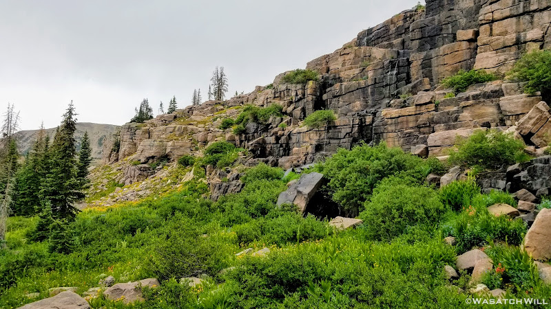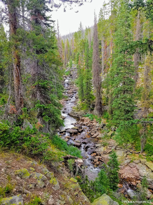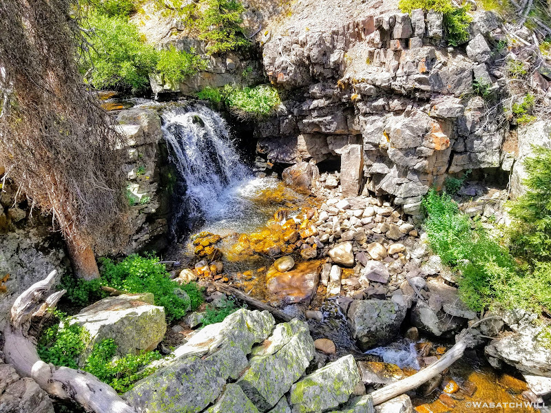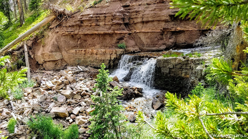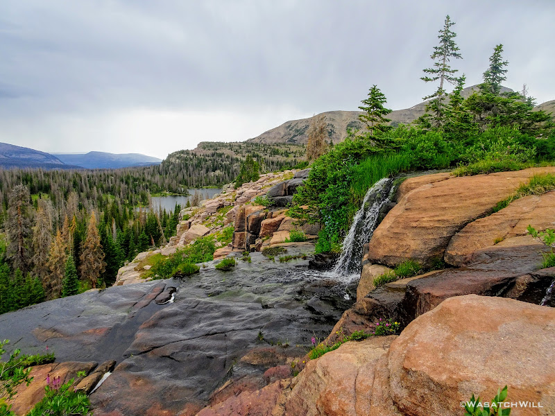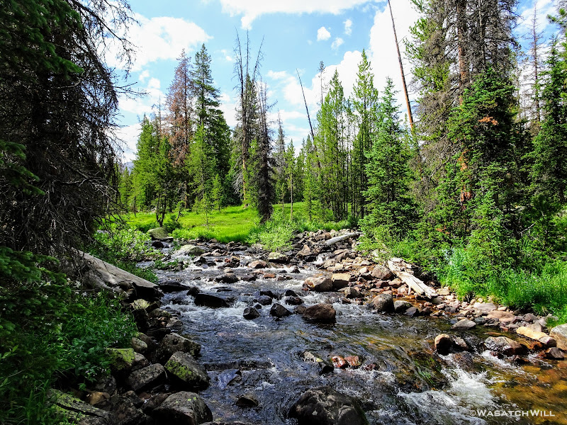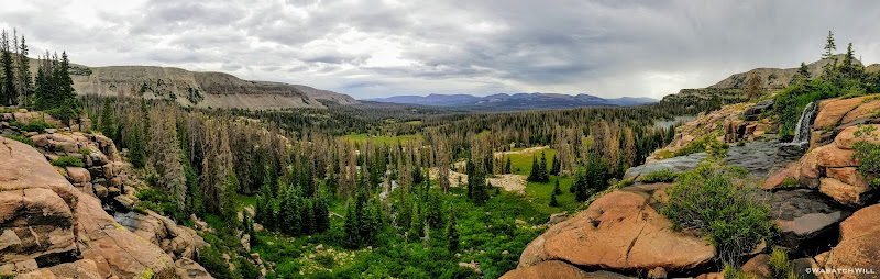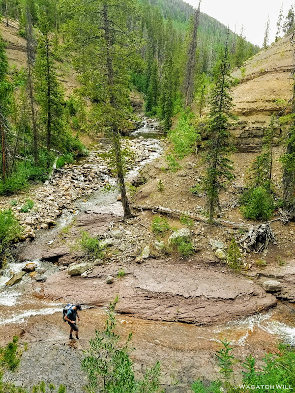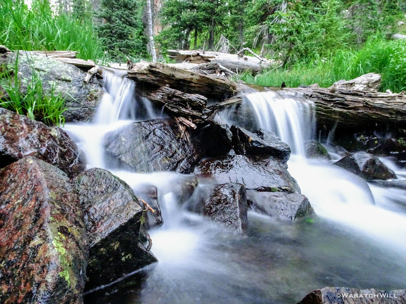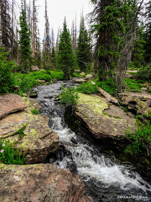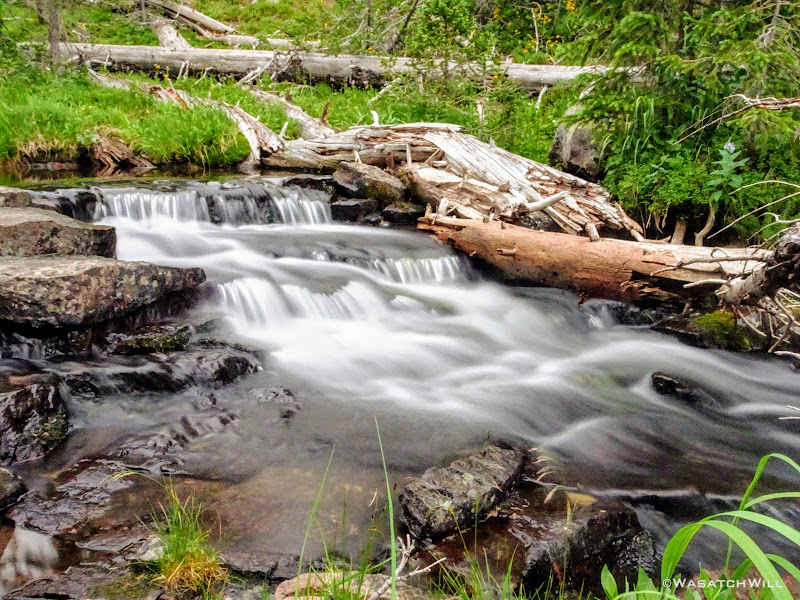 All geared up, we were able to hit the trail by mid-afternoon. The first couple miles ran parallel with the Duchesne River through dense forest leaving little for views. But occasionally we'd find ourselves passing by some nice little picturesque spots including a nice little unexpected waterfall.