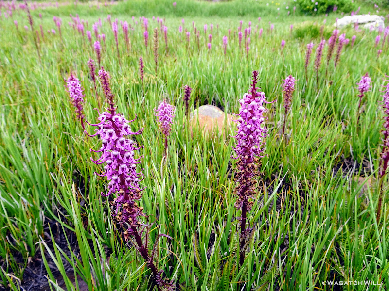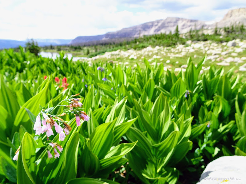 When we reached Shaler Lake, the rain backed off allowing the skies to lighten up a bit as we made our way out to the edge of the bench we'd have to now climb down to reach Jordan Lake. This part of the journey could have been relatively quick, but unexpectedly, the scenery grew more intense with more flowers, waterfalls, and continued vast views. The whole journey through this section was as much of a paradise as I can ever recall finding myself surrounded with and I wanted to soak up as much detail as I reasonably could along the way. I made many stops for pictures while Josh stayed as patient as a saint.