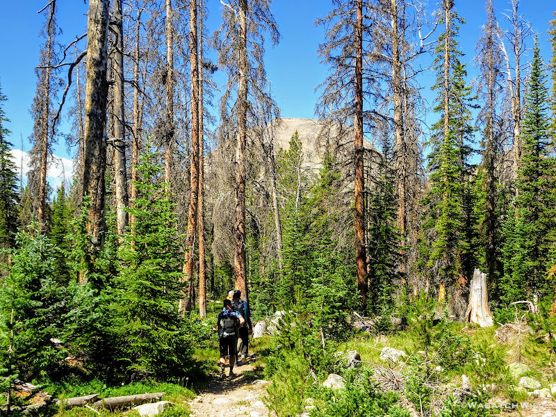 Once again, we got back on trail after breaking camp. This day's journey would take us up along the Head of Rock Creek Trail on the upper bench around, well...the head of Rock Creek Basin. For the rest of the morning, we'd be back on a stretch of trail I had not hiked before. I was excited to see what the views at Rosalie and Gladys Lakes were like as we made our way around.