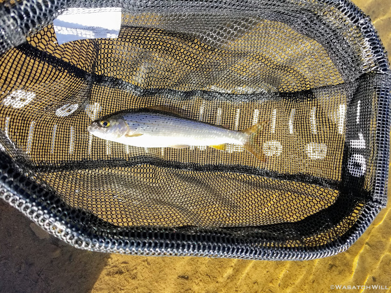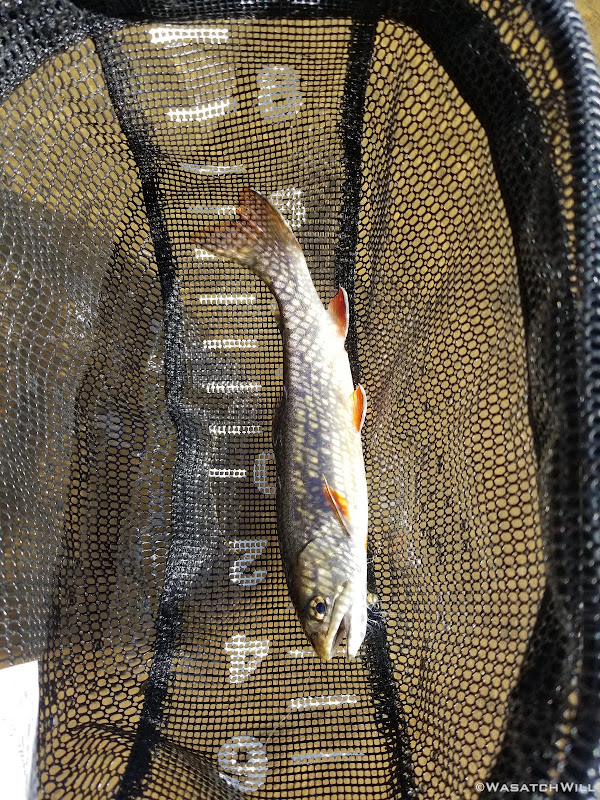 It didn't take too long to start getting some action. Soon I landed my first fish of the day, and to my surprise, it turned out to be an Arctic Grayling. I had no idea Notch Lake contained grayling. I knew of other lakes not far from Notch where it was popular to go fishing for these fish, such as Four Lakes Basin, but was completely ignorant of what all Notch Lake had, so it was a pleasant surprise, especially since I'd never caught this type of fish before.