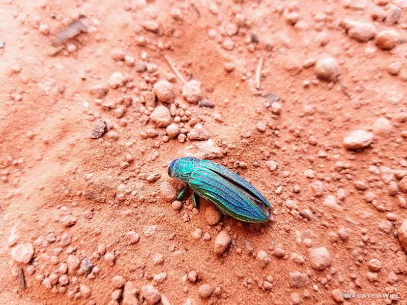 Raylee spotted this lifeless shiny beetle. She was very impressed with its colors.