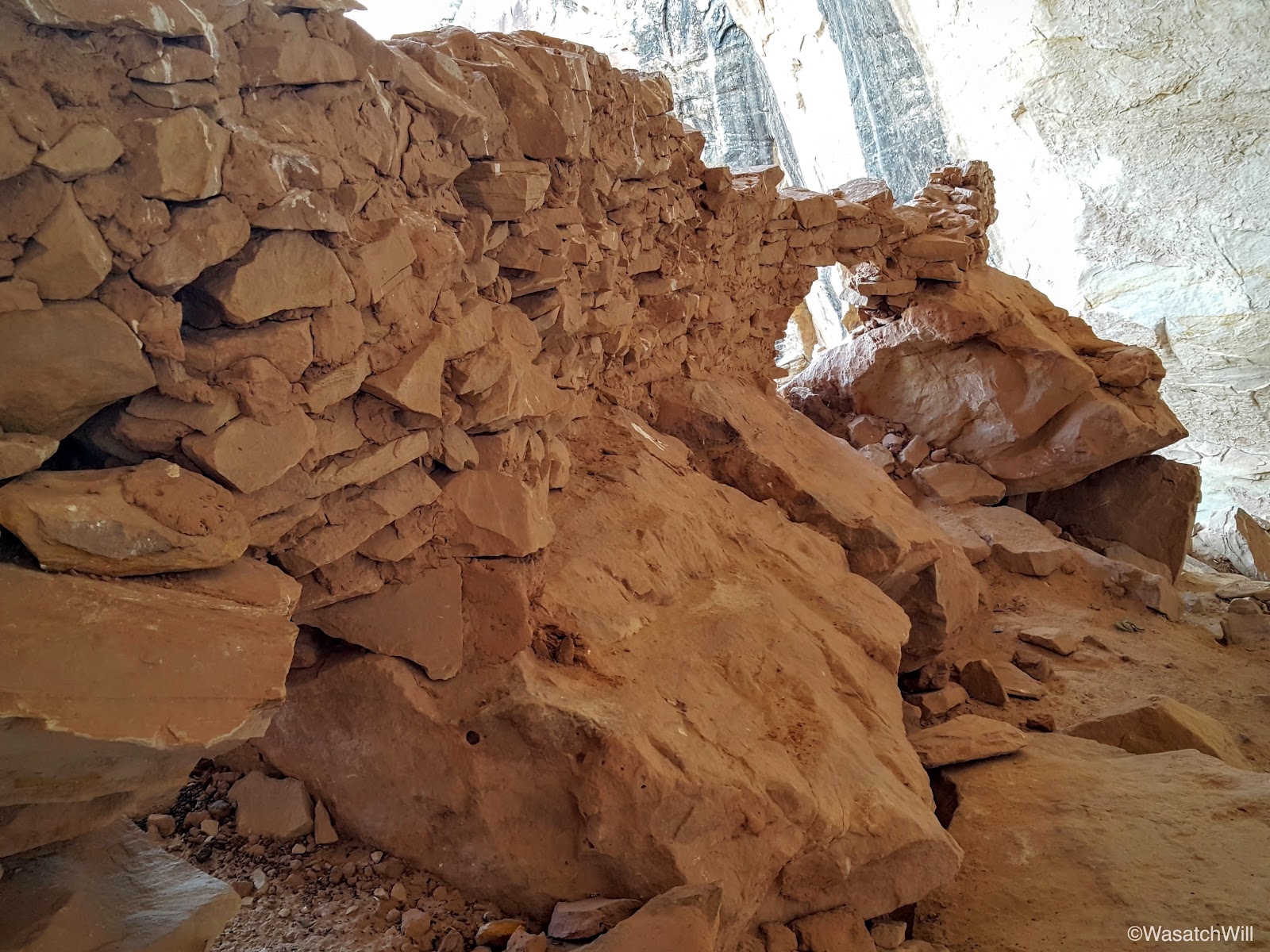 What makes this ruin unique isn't just its long continuous wall shared by all the many rooms (roughly 16 to 17) and hence its name, but it is also a dwelling built up in a north facing alcove. Most dwellings like this are found facing the south where they can capture the warmth of the winter suns among other benefits. Perhaps this was a great summer house then?