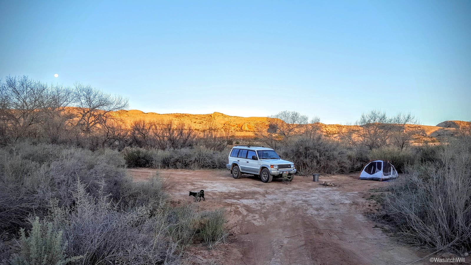 After a brief stop in Hanksville to top off on gas, we arrived at the campsite. As we got closer to it, given the lateness in the evening, I had grown nervous that it would already be taken, knowing that Salt Lake County schools, among others, were in the middle of their spring break. Much to my delight, it was perfectly empty. As I got out of the car, it became apparent why that may have been. The wind was relentless. I was tempted to head back up canyon to seek out a more sheltered spot, but no, I wanted to wake up here and Lennox had been sitting still long enough.