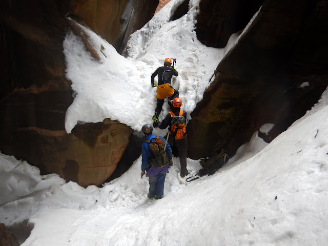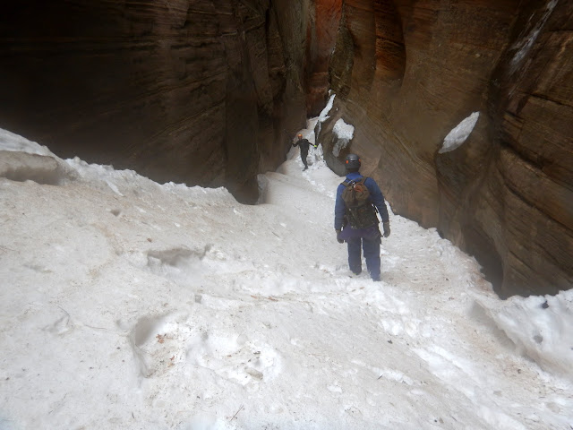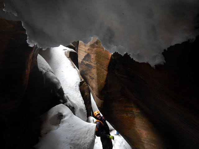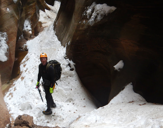 We encountered something different than I had seen before. There were places, with sand ripples on the canyon floor. WAIT! That was NOT the canyon floor, but solid and human supporting ice. Coulda swore I was on the ground. Small floods had moved sand across solid ice. We would drop off these false bottoms into swims. Tom was likely sick of hearing me talk of this experience, over the years. Same with Guy. Both signed up. Tom led most of the way, with a wicked little smile in the corner of his mouth. Guy stayed back spotting and generally helping us over the moats before dealing these dangerous spots as "last person at risk." Kat said no initially but changed her mind and joined us, ditching an important work meeting. I think she was pleased with her choice. A great time! Once the 6 hour round trip was over, I hit the road for home...The next big snow year? Yeah, I will be back. The stories I could tell of past snowy trips in there!!