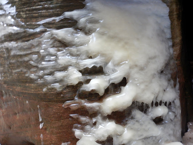 We get to the suit up spot and water is flowing...well....kinda fast. Well....maybe not so fast. We put on our monkey suits, me wet, her dry and head in. We see snow at the turn, going up the gully cross joint. It is 5 feet thick. Encouraging....BUT....the thing that worried most was.....are we going to be able to get up to the snow? There is a chockstone, rarely seen as it is buried in log debris almost always. Last year, we tunneled under a some logs, to get up through a hole to the top of this 10 foot falls, that starts from a swimmer. It was the hardest spot on approach.