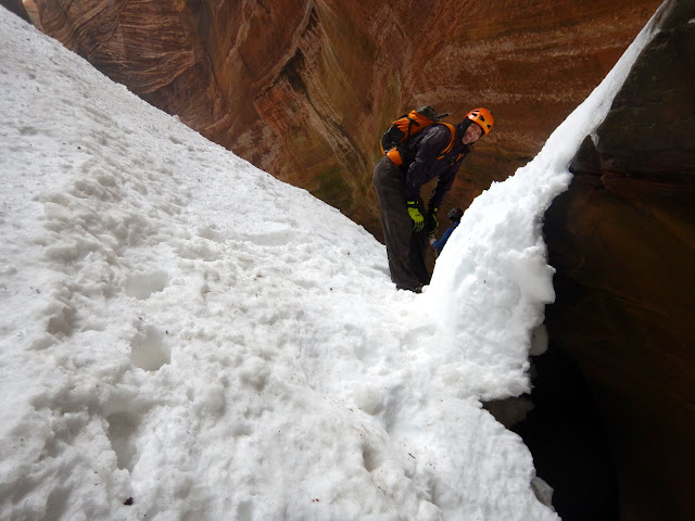 Cable Mountain towers above Middle Echo. It has just enough angle, that snow lands and accumulates for a bit, but it is too steep to hold the snow for long. So it slides down the wall and into the canyon in a series of mini avalanches. In this way, the canyon fills with snow, with every storm. It is unusual for there to be snow in May. It takes a huge snow year for that to happen, but an above average snow year will provide wonders to those who dare, in February and March. The thing about it, is almost every week the conditions and the route through can and does change. Snow has accumulated up to 85 feet high, then melts out, isolating slopes and forcing one to weave through tunnels and passage ways inside the snow masses. You often don't know you are so far up...until you see ....gulp....a hole. Other places, gaps in the moats form and the unwary could plummet dozens of feet, deep down into the unseen and black abyss.Then the blocks over head can collapse at any time. Huge icicles form overhead too, turning the canyon bottom to brown and blue ice fields with their icy drips. These areas are passed one at a time and without dallying. Also, down canyon snowfields tend to melt out along the canyon walls, in ways that the unsuspecting could break through to their demise.