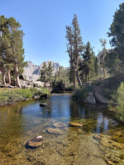 The next day, I packed up and moved my car out of the campground and headed up the trail. The Trail to Kearsarge Pass is steep and sunny. I'm very glad I did this in the morning because it was still pretty warm at 9am. This was a good resting spot with a little bit of shade and the sounds of the roaring creek.