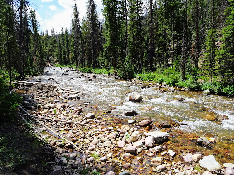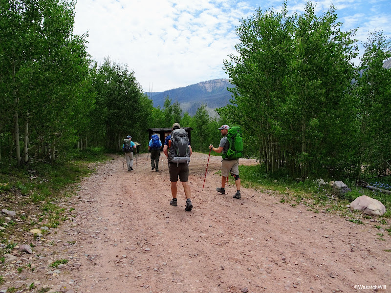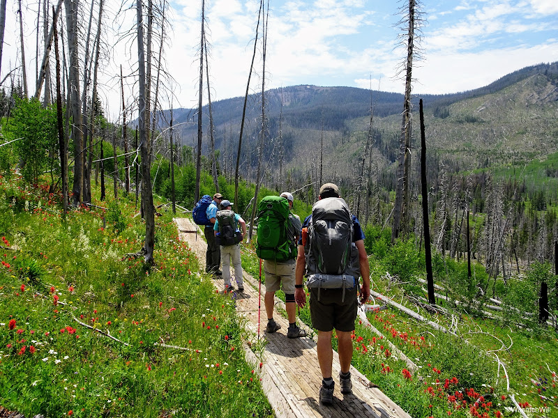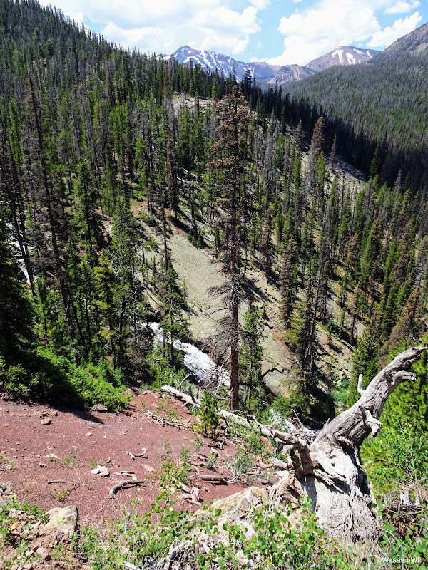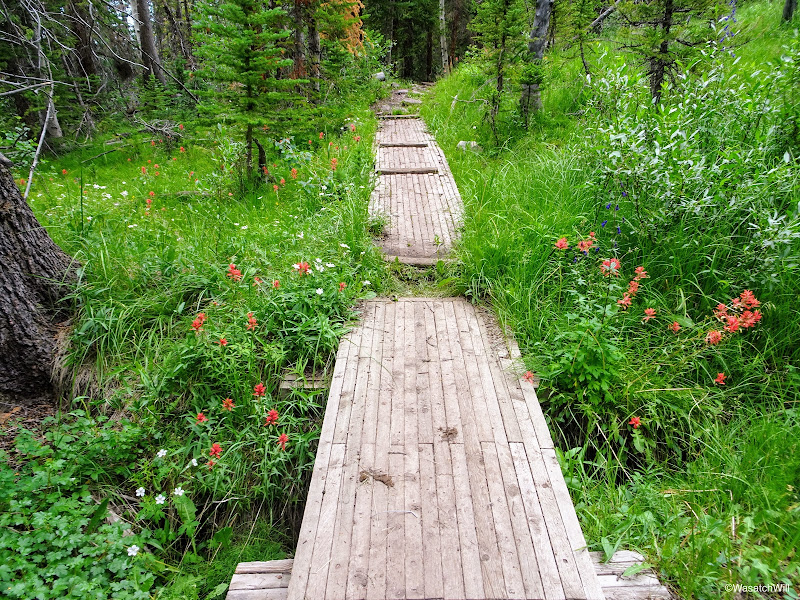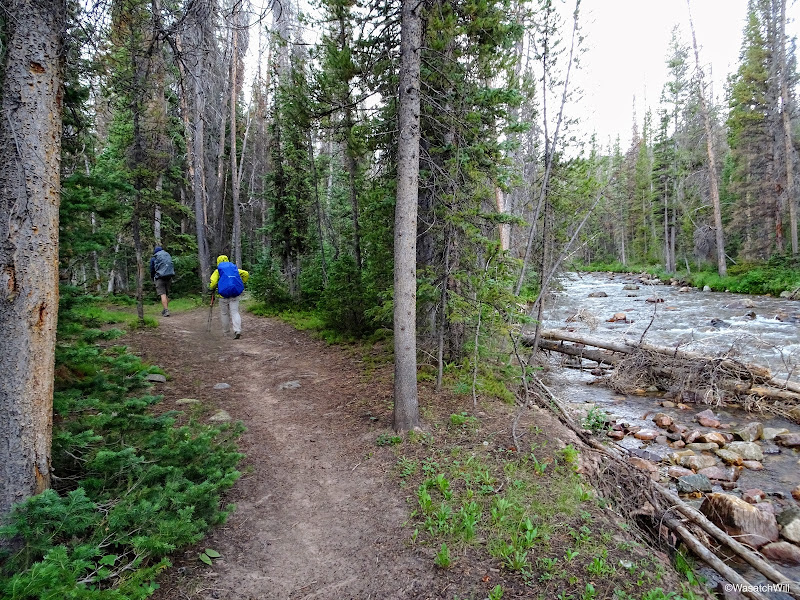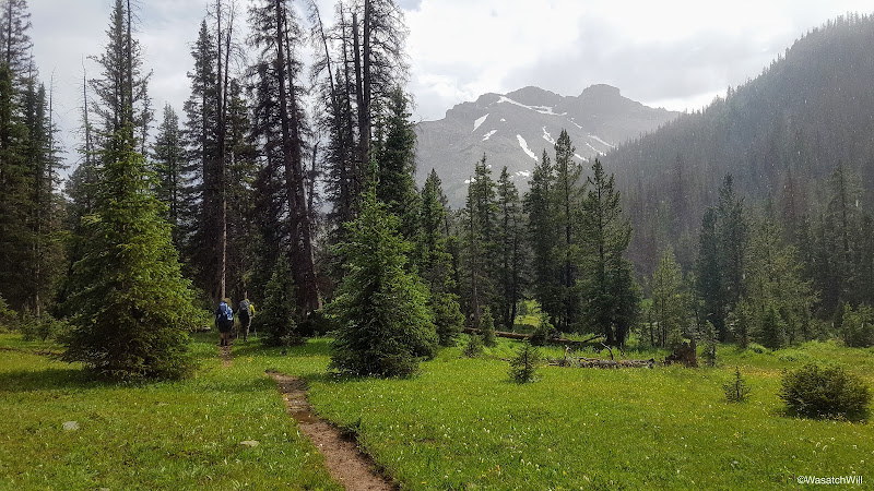 Within about 4 miles, we would be hiking under the cover of trees for long stretches over the next couple miles. Through this section we saw some more wildflowers and stopped for quick rests at the Wilderness marker and the junction with the fork up to Priord Lake. Through this section, we'd also be enveloped with a good bit of rain, hail, thunder, and lightning that would linger around for a good hour or two. In the 'shelter' of so many trees, we hiked on through.
