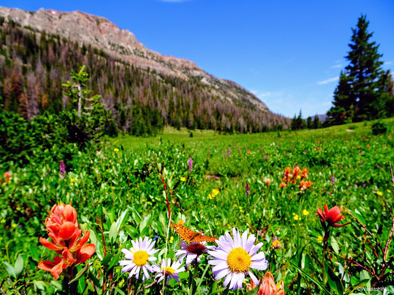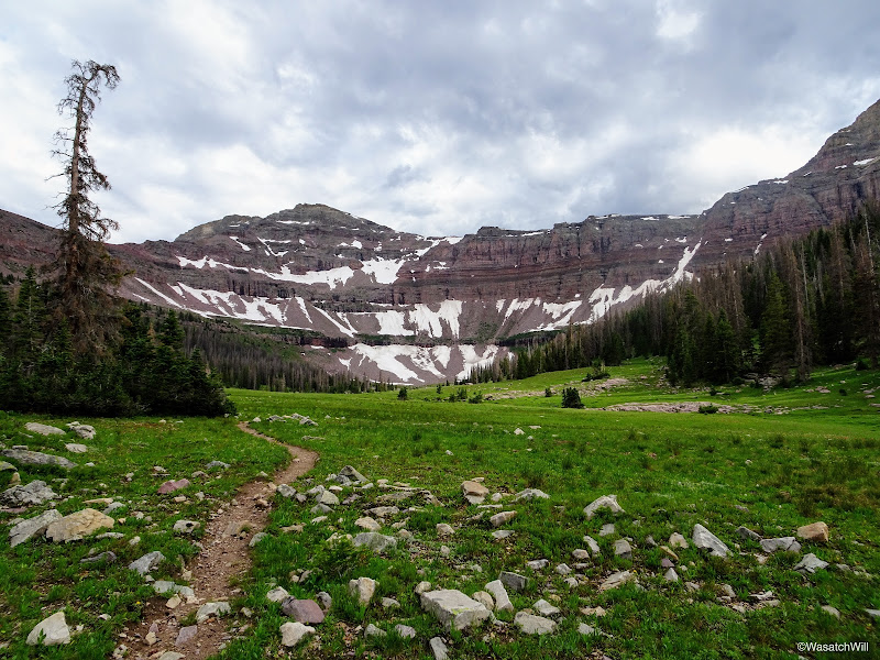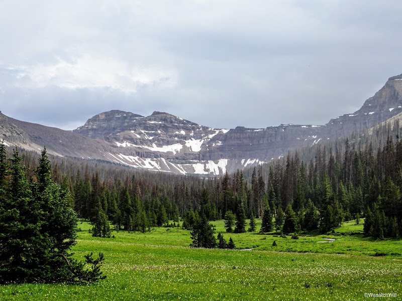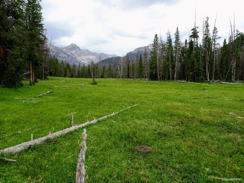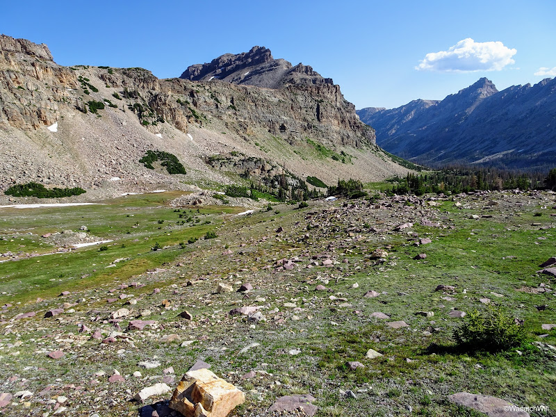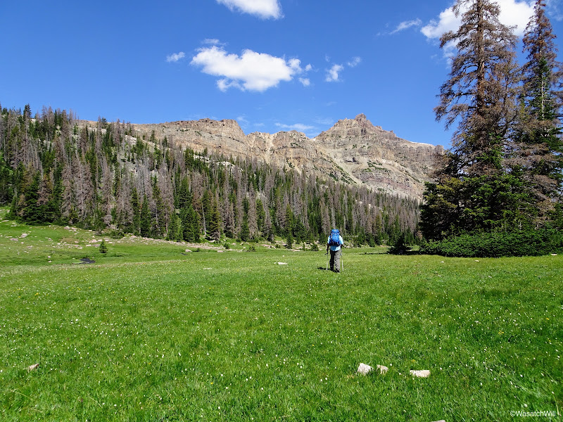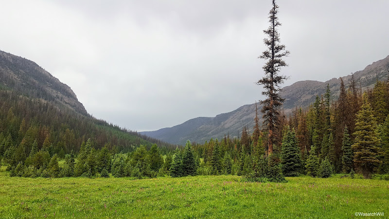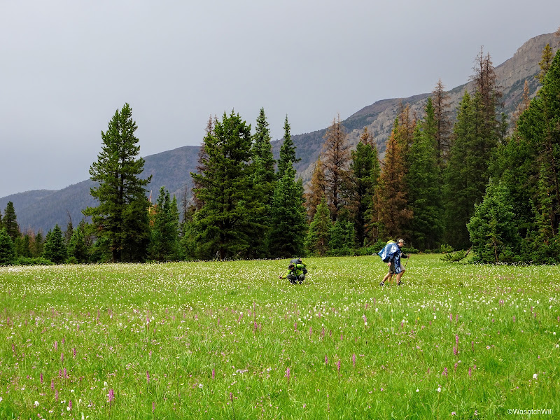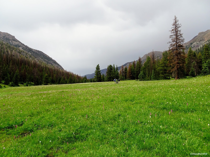 As the clouds began to break apart, the meadow became more and more magical as it were. The grassy flats remained aglow and began to twinkle and sparkle as rays of sunlight reached forth and penetrated from the clouds above. Wildflowers were scattered all about us. To add to the view and the excitement of being present there at that moment, we could now see the end of the basin. We now had a visual of Dead Horse Peak showing us how far we had to go to reach the lake at the upper end of the basin.