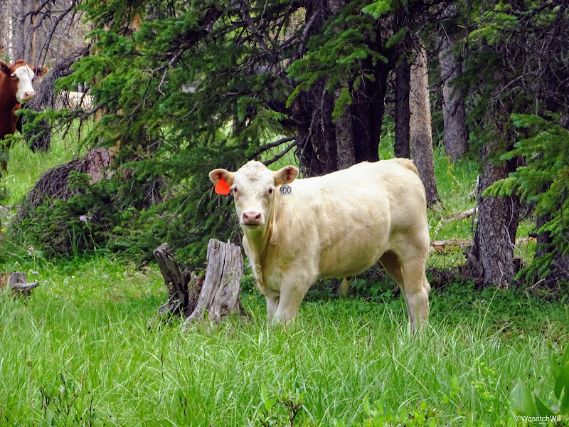 Soon after the cabin, we were greeted by the resident herd of cattle. Needless to say, because of these guys, the trail was littered with cow pies the whole way up to the lake.