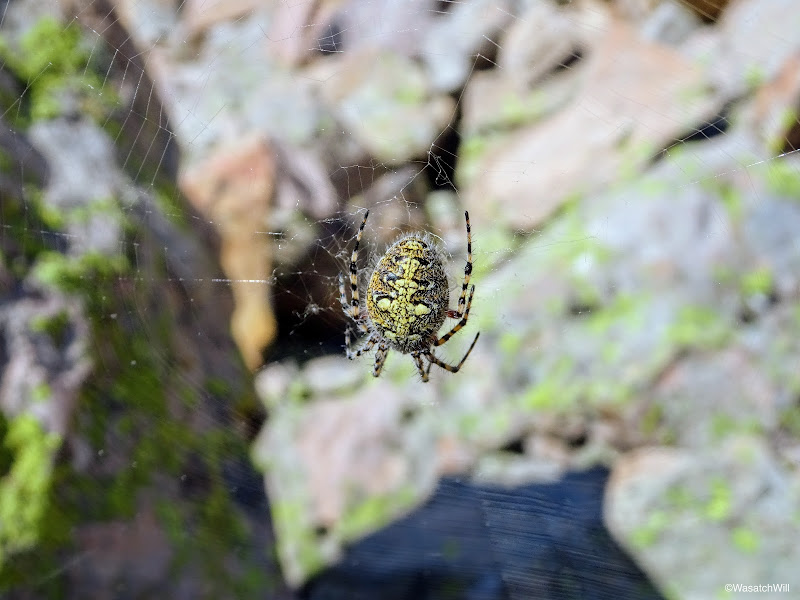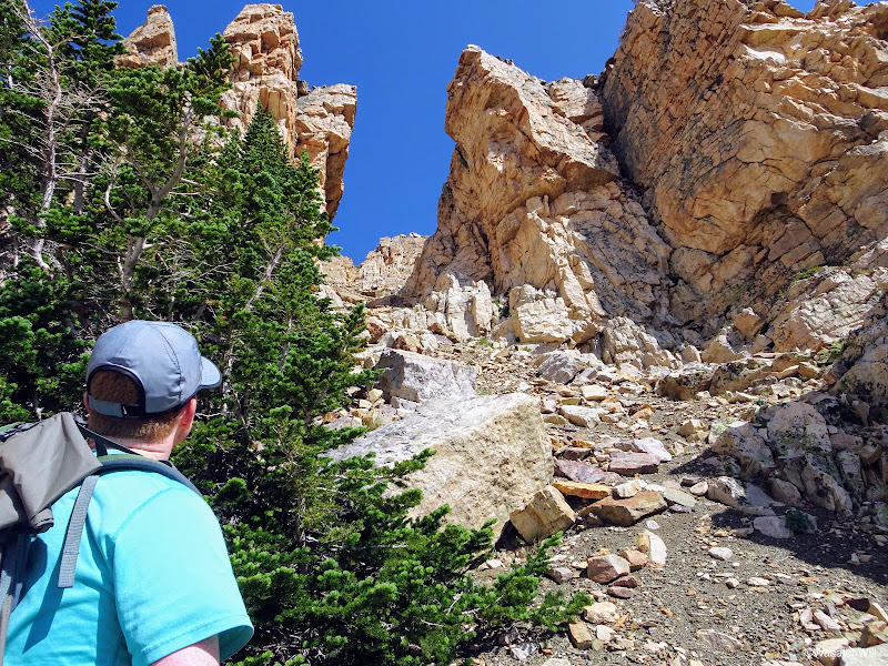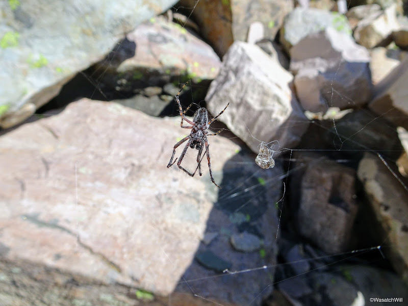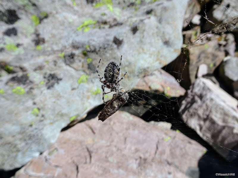 The map I had marked out and modified actually showed a route up and over as per the USFS 2016 map through a notch in the ridge toward the south. Jackson and I picked a line up the moraine to the notch on my map and began the boulder scramble up it. Along the way we'd have to watch our step extra carefully lest we walk through a number of active spider webs.