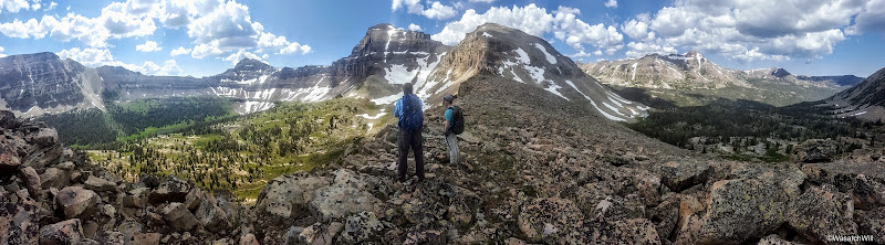 In our approach to that spot on the ridge, we encountered Blake making his way up to the same spot. Adam and Brett chose to linger around the lake. Apparently, Blake had not updated his map from the copy I originally laid out when we first started planning this trip, so his map was leading to the original spot over the ridge I had marked out. We intersected each other just below the ridge, and for Jackson and I, the 3rd attempt to find the right way over proved to be the charm. We had finally found it at the spot marked out on my original map. It was tempting to venture on down and go out for a look down at Norice and Priord Lakes, but that would require losing and regaining a lot of elevation off the ridge and there were already a number of clouds developing now with darker ones out on the distant horizon. We knew it would be storming that afternoon and it was only a matter of how soon it would all roll in.