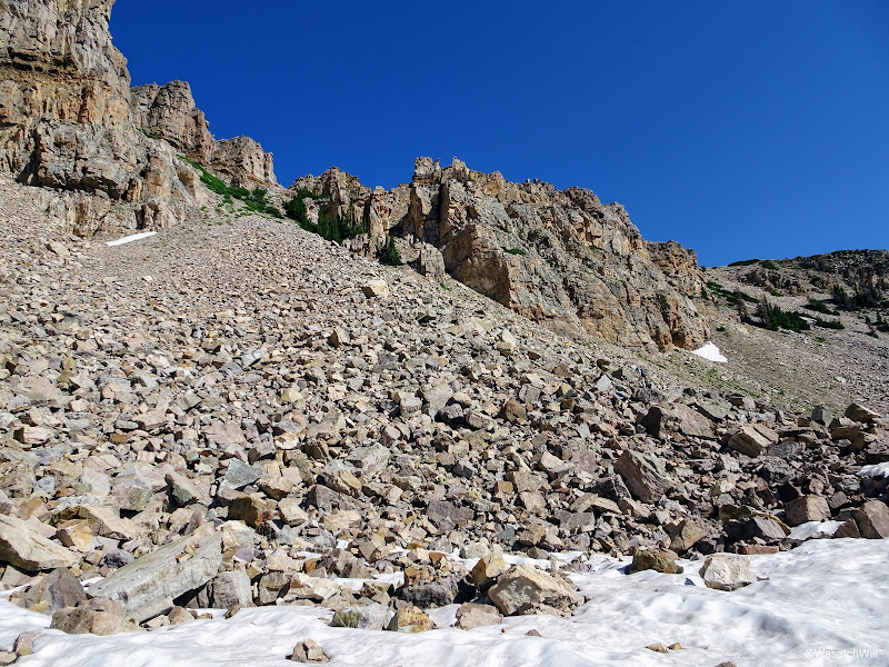 Not to be stifled, we made our way back down the chute we had come up and traversed the moraine northward to another promising looking notch. We scouted that out, only to hit another dead end.