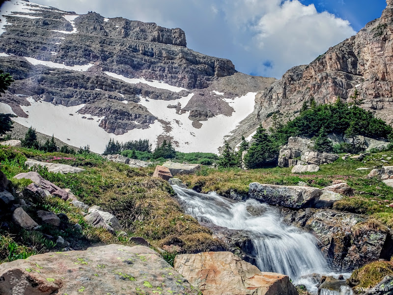 Morning came and once again, clear blue skies surrounded us. The day before, Jackson and I mulled the idea of using this morning to scout out the ridge to the east and southeast of us, standing between Allsop and Dead Horse Lakes. Instead, we scrapped that idea. With everyone else still asleep when I awoke, I ventured on out to do some picture hunting. I specifically targeted a waterfall high up above the western shore of the lake that I had only noticed while fishing the evening before.