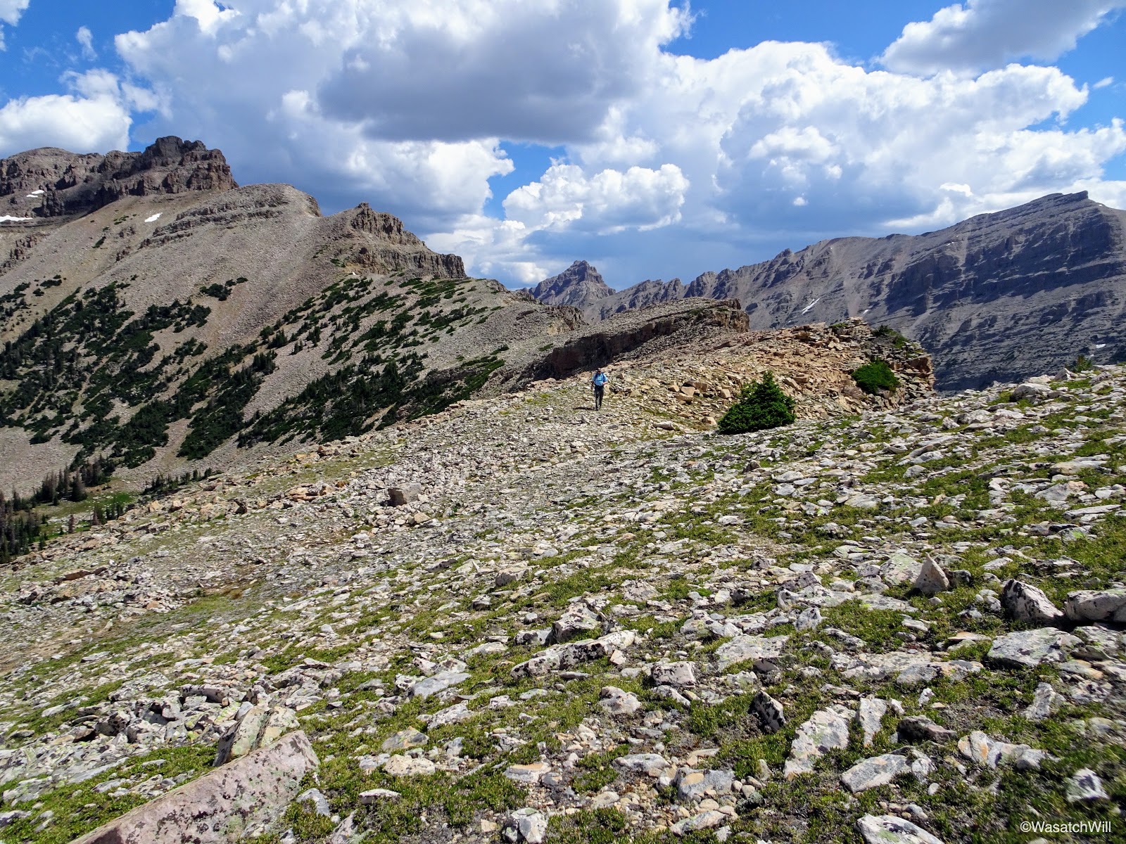 In our approach to that spot on the ridge, we encountered Blake making his way up to the same spot. Adam and Brett chose to linger around the lake. Apparently, Blake had not updated his map from the copy I originally laid out when we first started planning this trip, so his map was leading to the original spot over the ridge I had marked out. We intersected each other just below the ridge, and for Jackson and I, the 3rd attempt to find the right way over proved to be the charm. We had finally found it at the spot marked out on my original map. It was tempting to venture on down and go out for a look down at Norice and Priord Lakes, but that would require losing and regaining a lot of elevation off the ridge and there were already a number of clouds developing now with darker ones out on the distant horizon. We knew it would be storming that afternoon and it was only a matter of how soon it would all roll in.