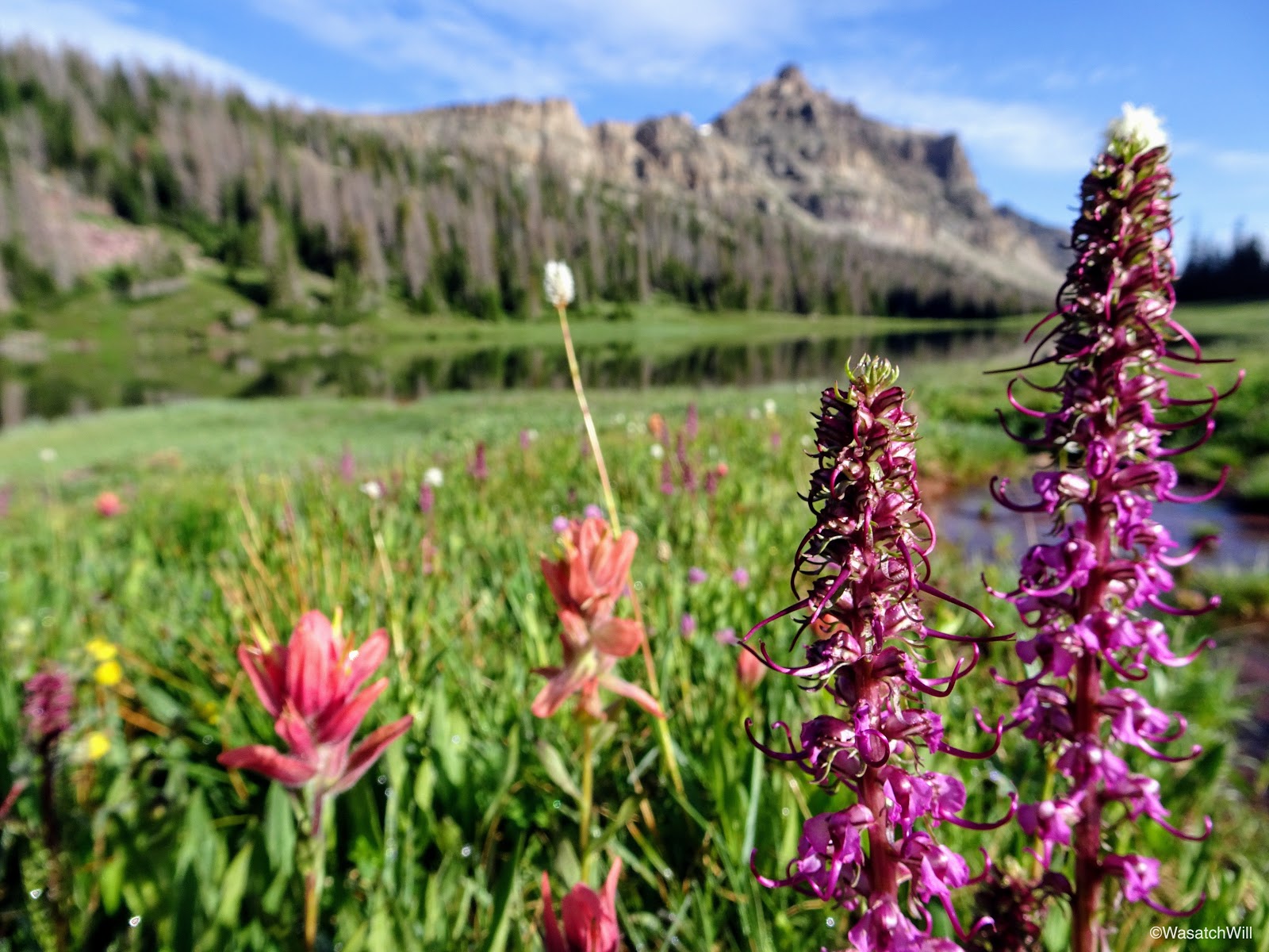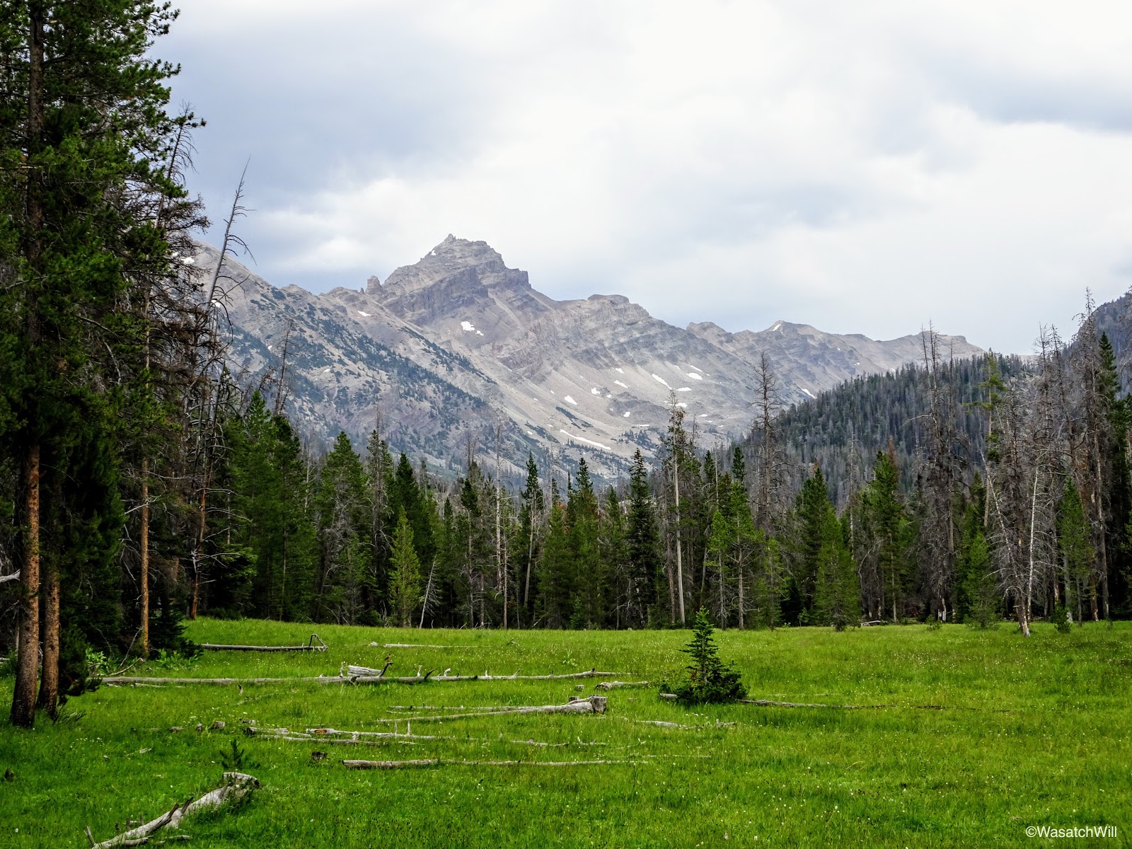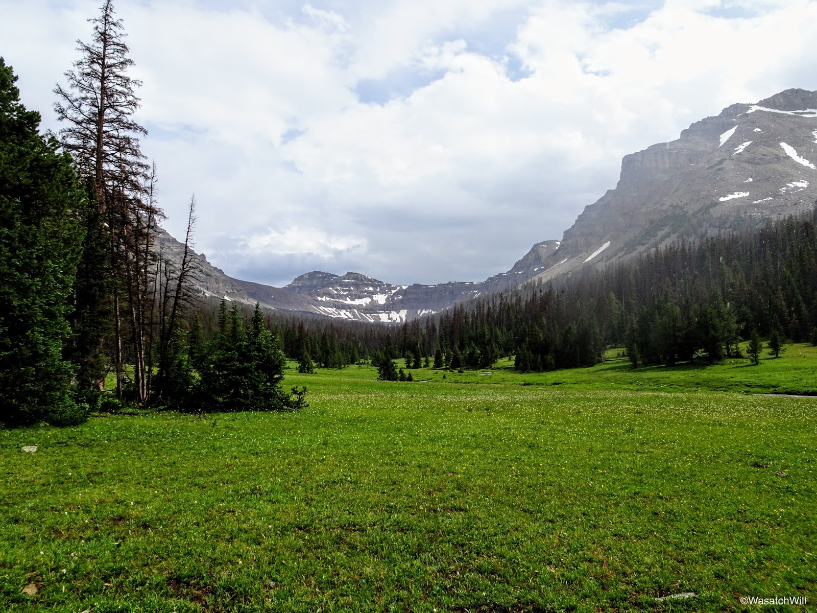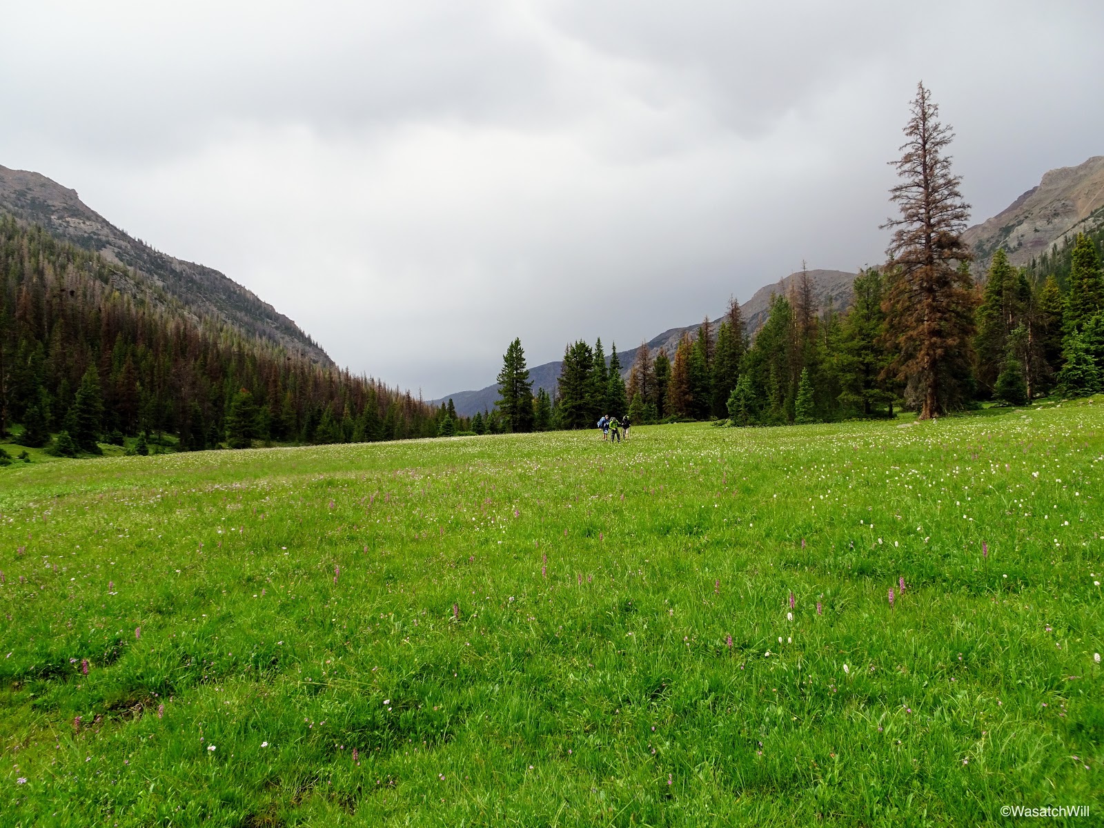 As the clouds began to break apart, the meadow became more and more magical as it were. The grassy flats remained aglow and began to twinkle and sparkle as rays of sunlight reached forth and penetrated from the clouds above. Wildflowers were scattered all about us. To add to the view and the excitement of being present there at that moment, we could now see the end of the basin. We now had a visual of Dead Horse Peak showing us how far we had to go to reach the lake at the upper end of the basin.