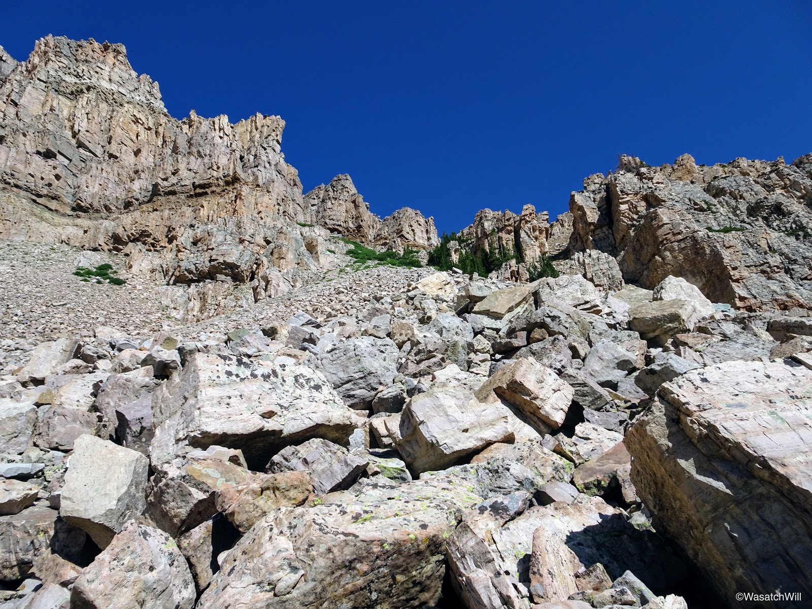 Not to be stifled, we made our way back down the chute we had come up and traversed the moraine northward to another promising looking notch. We scouted that out, only to hit another dead end.