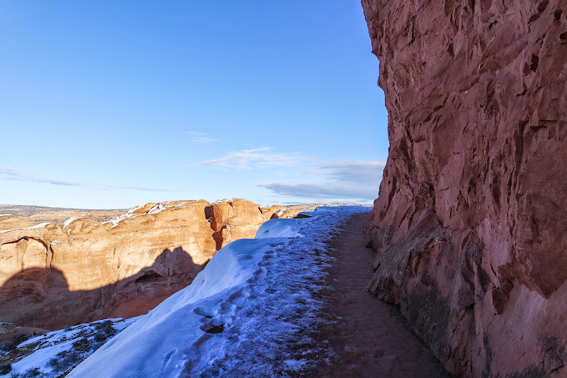 After that experience, it was starting to get late. So we headed for Delicate Arch. It was about 2:30 when we headed up. The hike in was good until we reached the ledge section of the trail. Here it is in shade most of the day and the trail became icy and slick. But with only a few slips and bruises we made it to the arch. Here there were lots of tourists waiting for the perfect shot. Luckily there weren't many standing under the arch and I could get a few pictures without anyone in it.