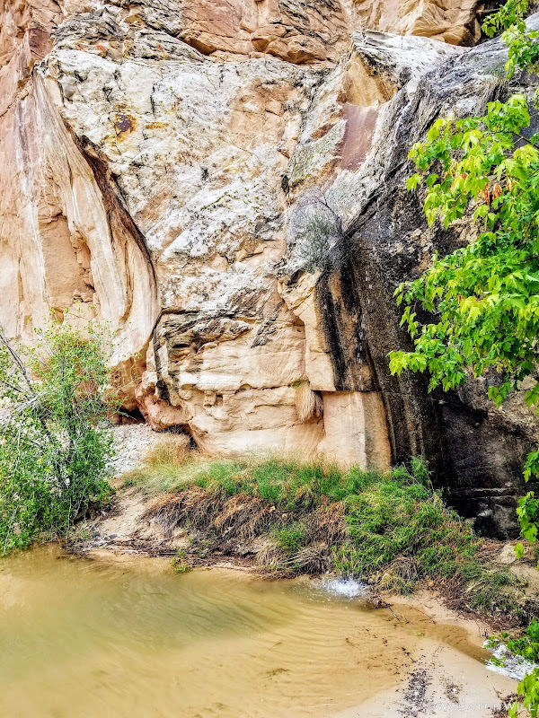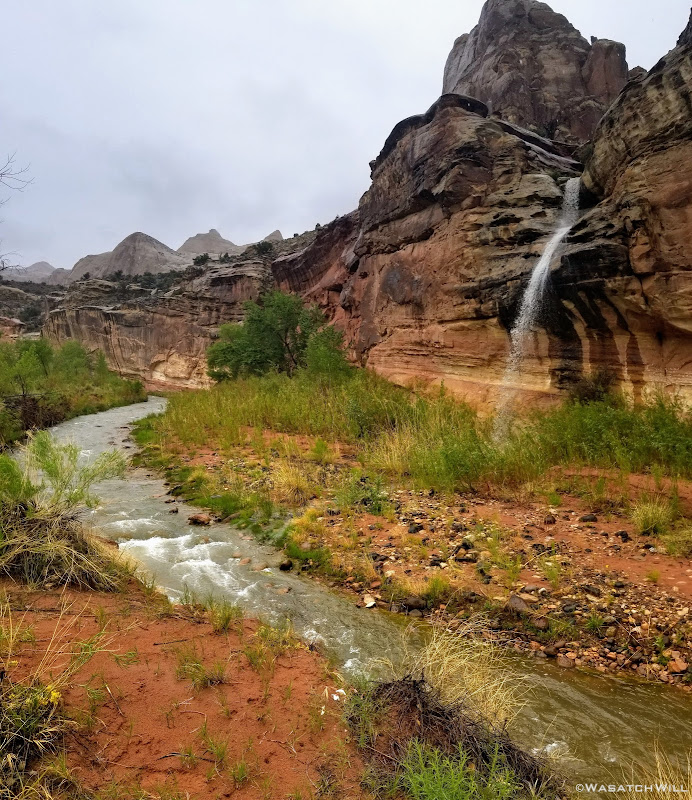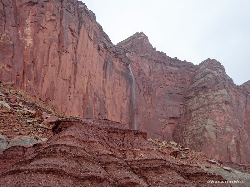 We had initially wanted to hike Halls Creek Narrows, but recent rains had made road conditions out there uncertain. Not only that, but another big rain storm was forecasted for Monday. And when Monday arrived, rain it did, very much, throughout the day. So...by mid-day, we ended up gathering the kids into the car and went for a ride along with my in-laws to go chasing waterfalls down in Capitol Reef along the highway, ephemeral waterfalls that is, created by said rain.