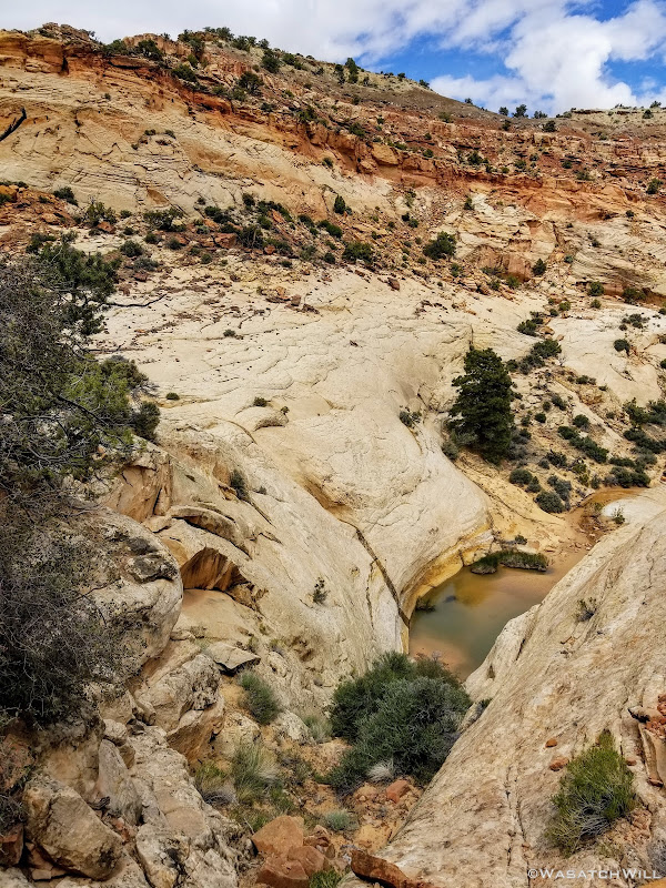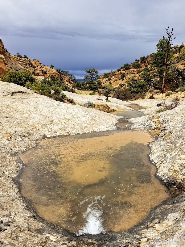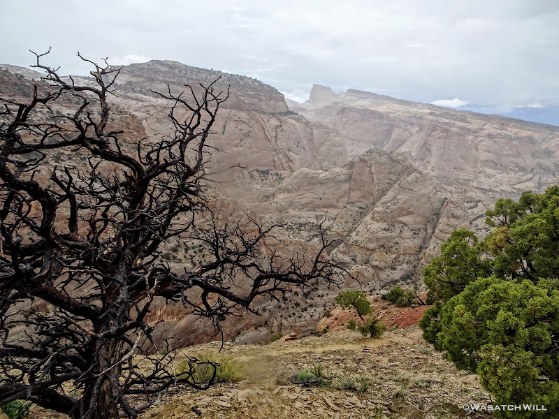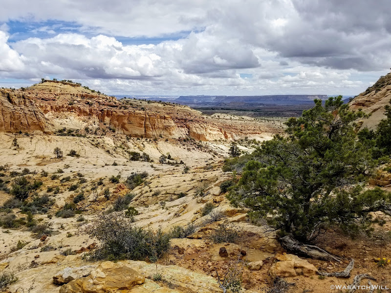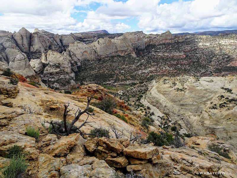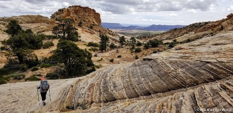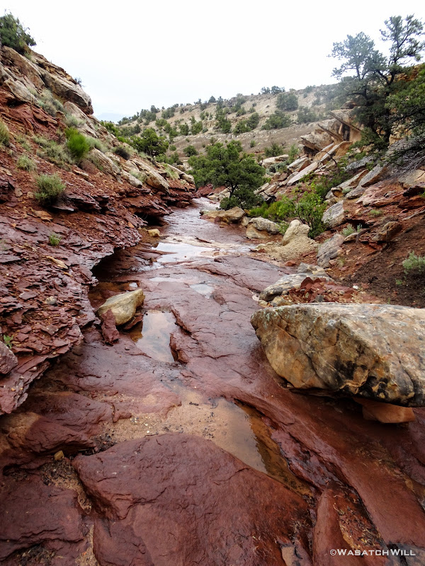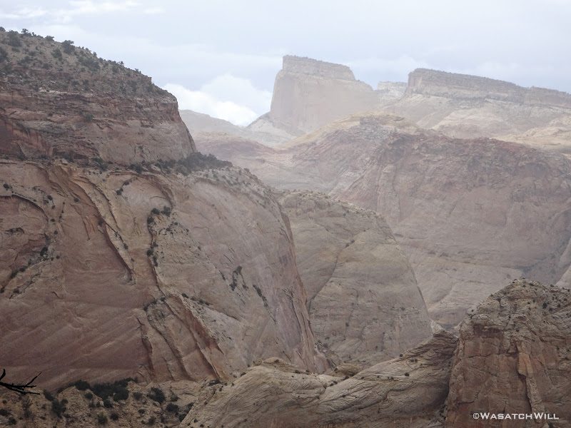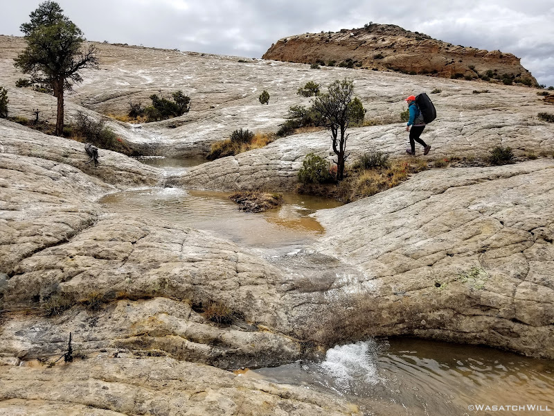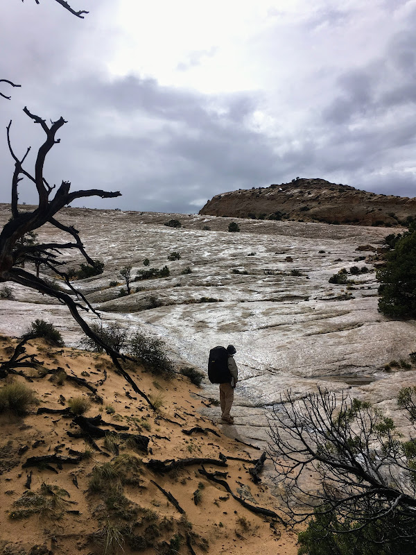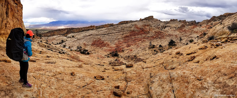 Tuesday came and with it, a forecast for more showers, at least in the afternoon. It wasn't nearly the forecast for what hit the area the day before. In fact, the morning featured a fair bit of sun with the promise of drying things about a bit. Despite more showers forecasted for the afternoon, Jess and I opted to go for it and put in a night up on the mesa top that lies between Capitol Gorge and Pleasant Creek. Because it has no official name, and is part of the Waterpocket Fold that does indeed feature a lot of waterpockets and potholes throughout many of its drainages, I'm hence forward calling "Pleasant Pocket Mesa".
