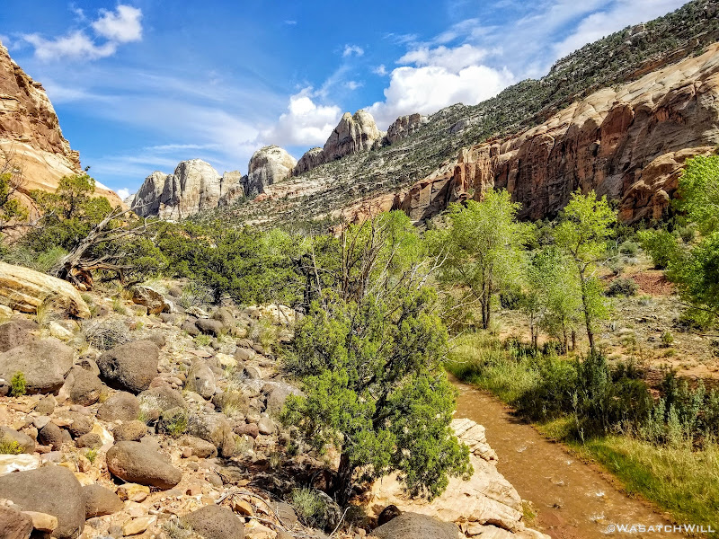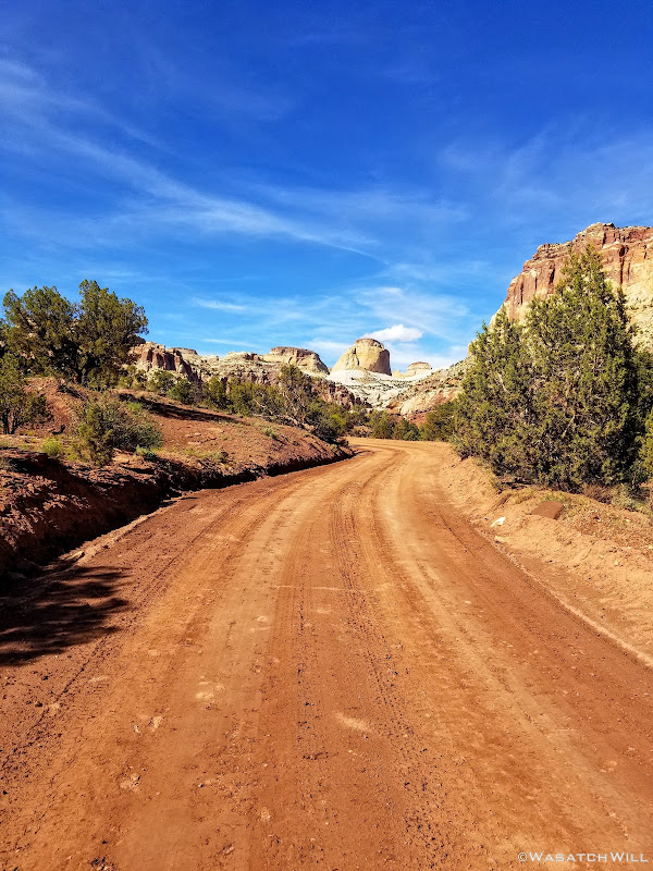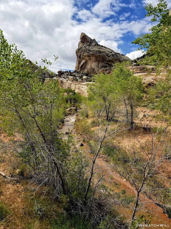 We pulled into Capitol Reef's Visitor Center about mid-day and secured our backcountry permit. From there, it was on down the road to Capitol Gorge. I had brought a bike down with us to Torrey to serve as a shuttle for the Pleasant Creek Road and trailhead, but again, due to the rains the day before, that road had been closed. So...that meant we'd have to hike an additional 5 miles and do a complete loop. To split those miles up, we parked at the upper trailhead for Capitol Gorge beneath Ephraim Hanks Tower. From there, we hiked the 2+ miles down to the dirt road to the lower trailhead.