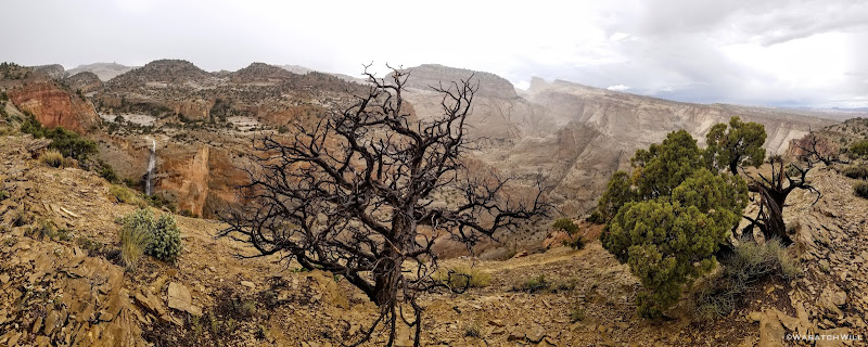 What I didn't anticipate with the big view was a big waterfall flowing off the cliffside out across from us when we got there. I had been to this spot twice before, under much more "favorable" weather conditions where such a waterfall had not been. As with the ones encountered along the highway the day before, this was one that is a very rare sight, formed only when enough rain hits the area, producing enough run-off to form such a spectacle. We felt privileged to witness this almost mystical display of nature. Such a sight was indeed worth the cold, blustery winds and stinging rain drops that was now assaulting our faces.