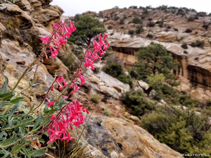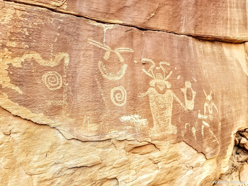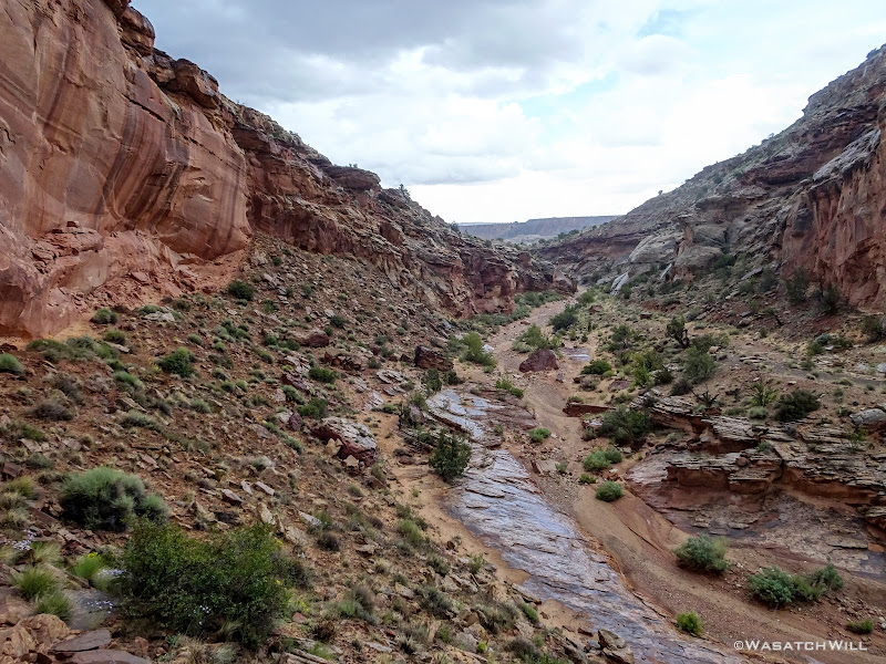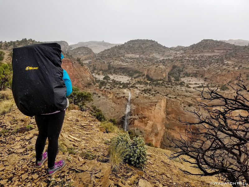 Near the end of the gorge, I led Jess up to see some of the rock art that Devin and I had discovered last fall along our big Beehive Traverse trip. While there, we got teased with a bit more rain.