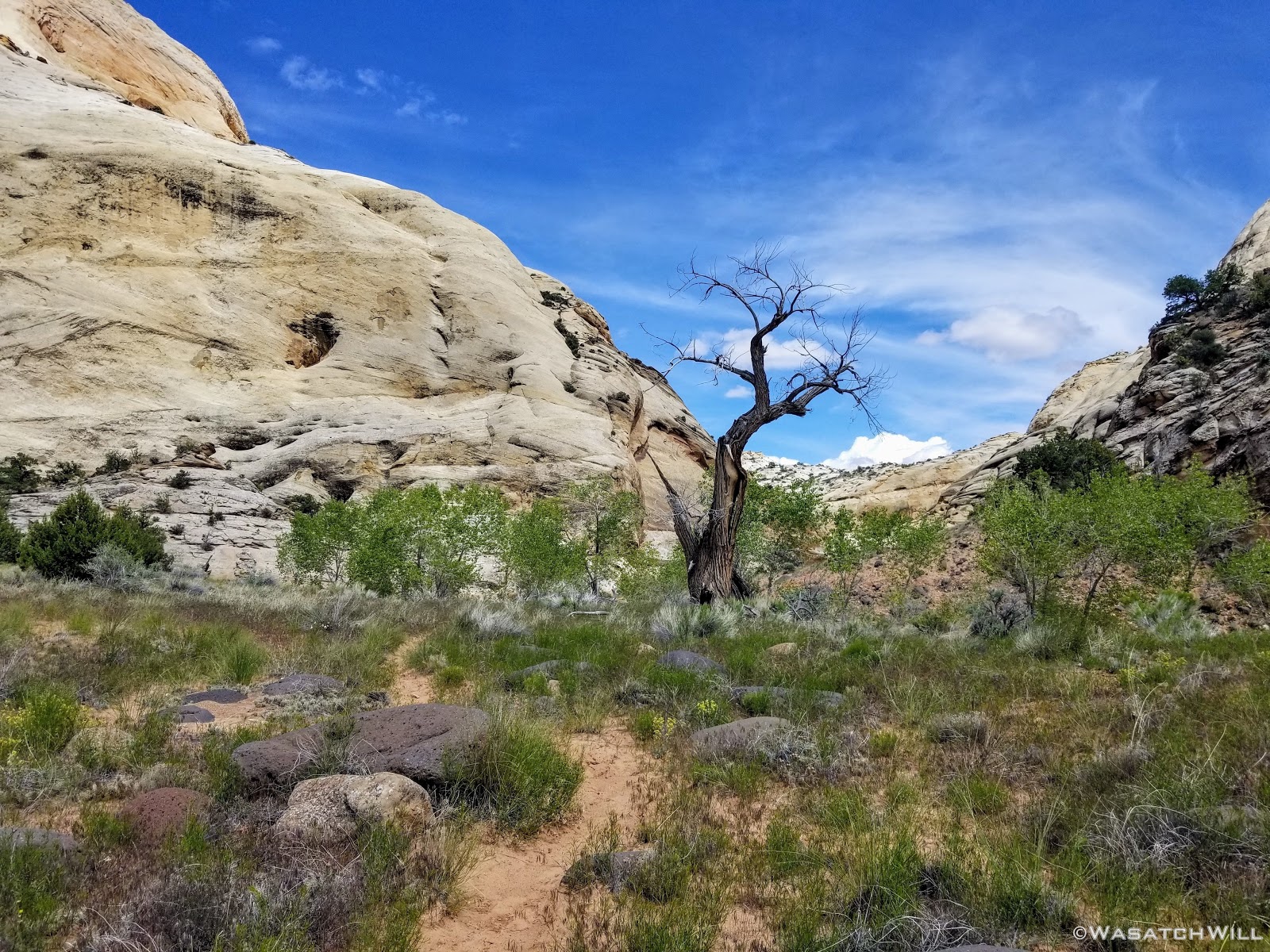 We pulled into Capitol Reef's Visitor Center about mid-day and secured our backcountry permit. From there, it was on down the road to Capitol Gorge. I had brought a bike down with us to Torrey to serve as a shuttle for the Pleasant Creek Road and trailhead, but again, due to the rains the day before, that road had been closed. So...that meant we'd have to hike an additional 5 miles and do a complete loop. To split those miles up, we parked at the upper trailhead for Capitol Gorge beneath Ephraim Hanks Tower. From there, we hiked the 2+ miles down to the dirt road to the lower trailhead.