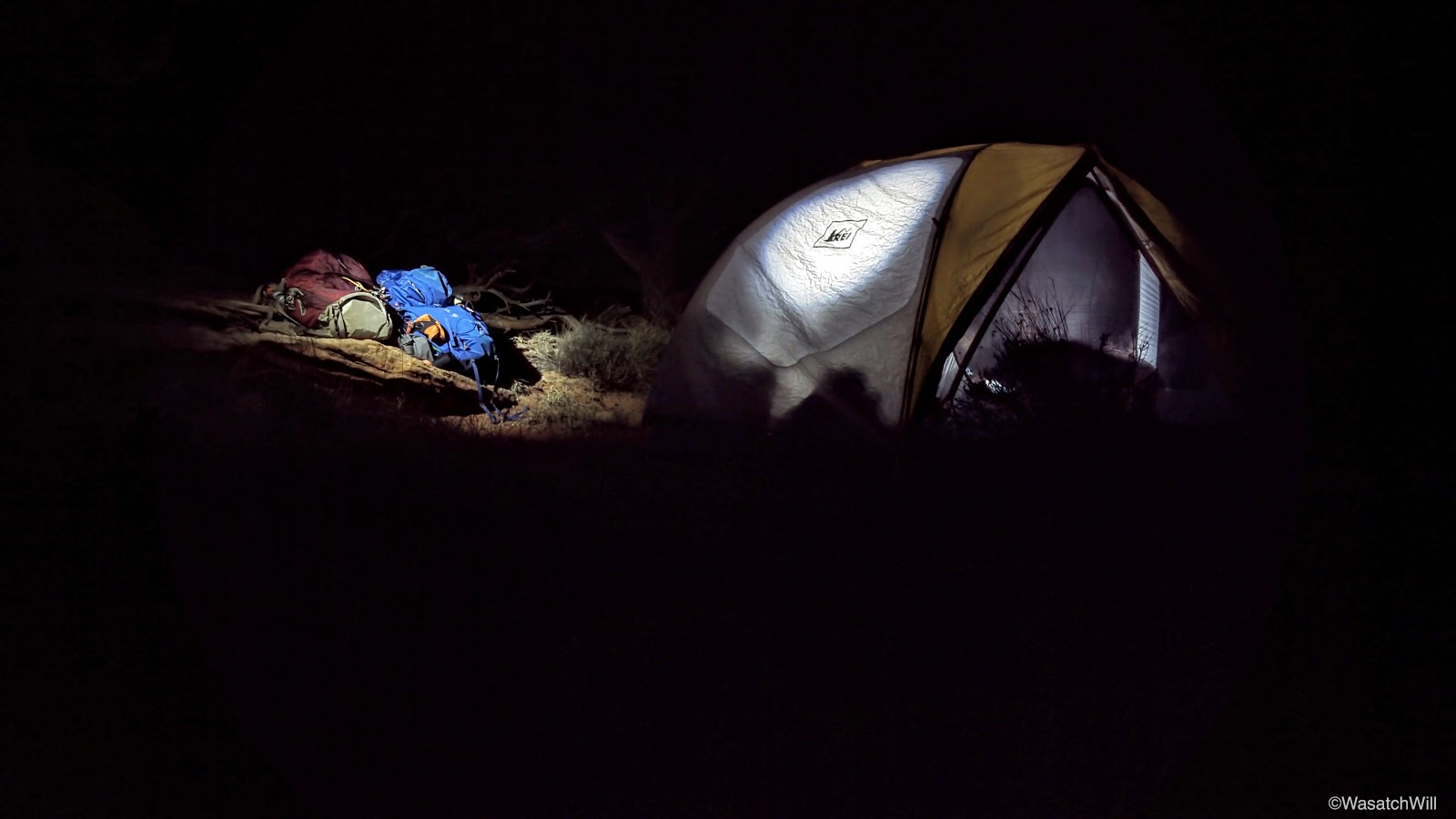 I also tried some light painting on the rock wall above our camp, but my phone's camera didn't prove to be sensitive enough to capture enough light to make it look decent. I also tried some star pictures, but again, nothing much there. I then just settled for a couple tent shots while painting our packs and a nearby tree that were much closer to the tent.