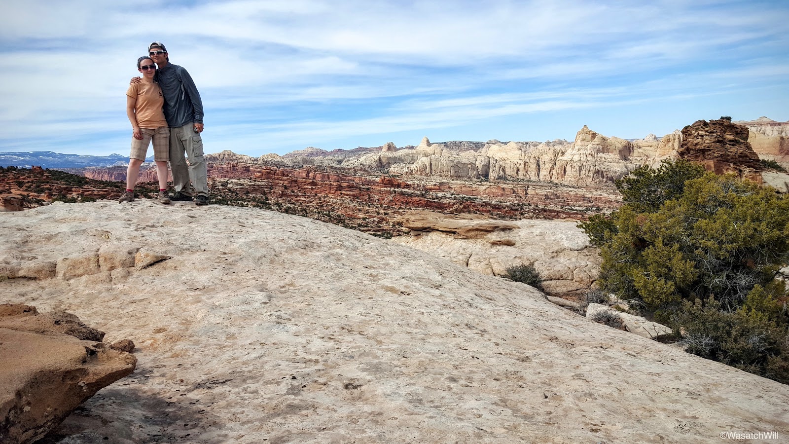 We were actually surprised to find nobody else around when we got there. Last time I had made it up to Cassidy Arch, there were dozens around the arch, and dozens upon dozens more going up and down the trail leading out to it from Grand Wash down below. It was awesome to have it all to ourselves, but at the same time, it also meant there was nobody else around we could ask to take a routine picture of us standing atop the arch together. We spent a good half hour or so enjoying the sight and taking individual turns going out on top of the arch.