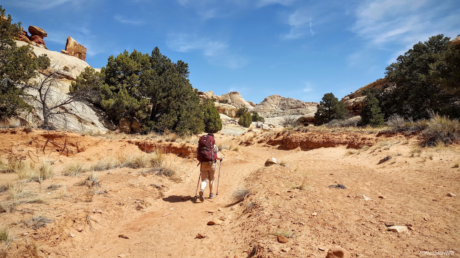 This trip started and ended in Fruita where the Capitol Reef Visitor Center is located. There, we checked in and picked up our backcountry permit. From there, it was a quick minute drive down to "the pasture" lot to park the car and begin the ascent up the switchbacks into Cohab Canyon.