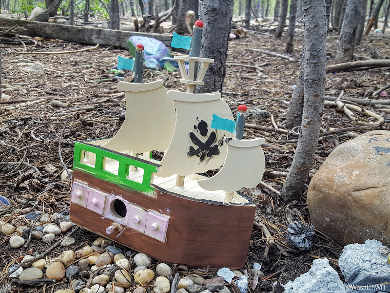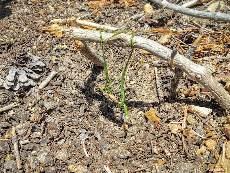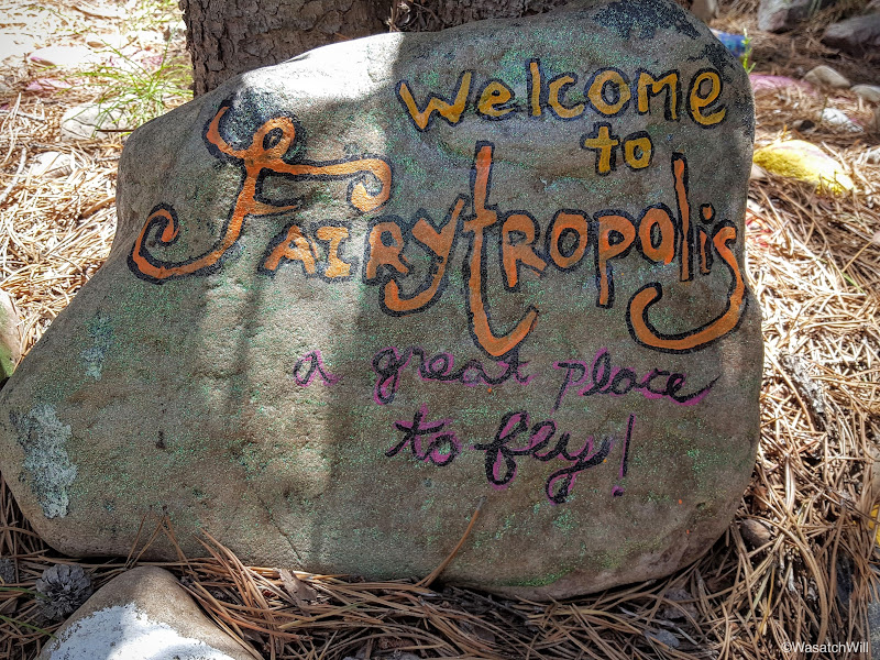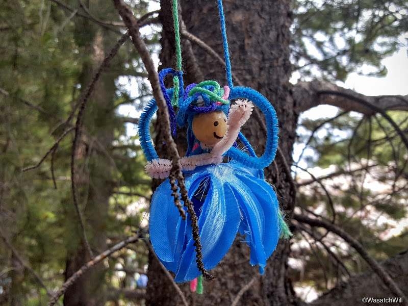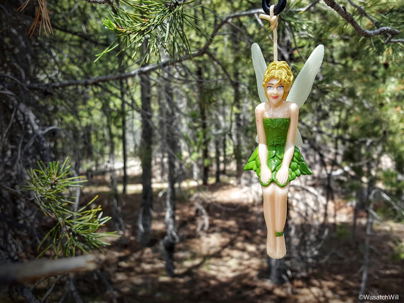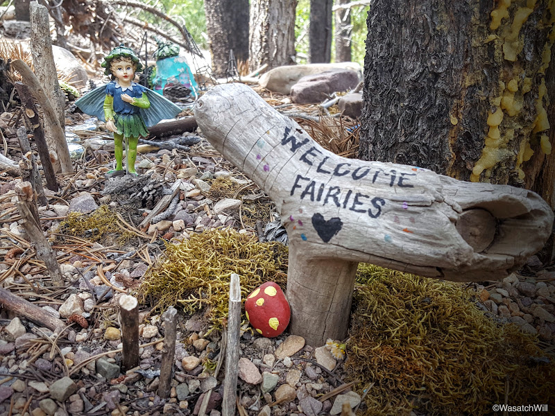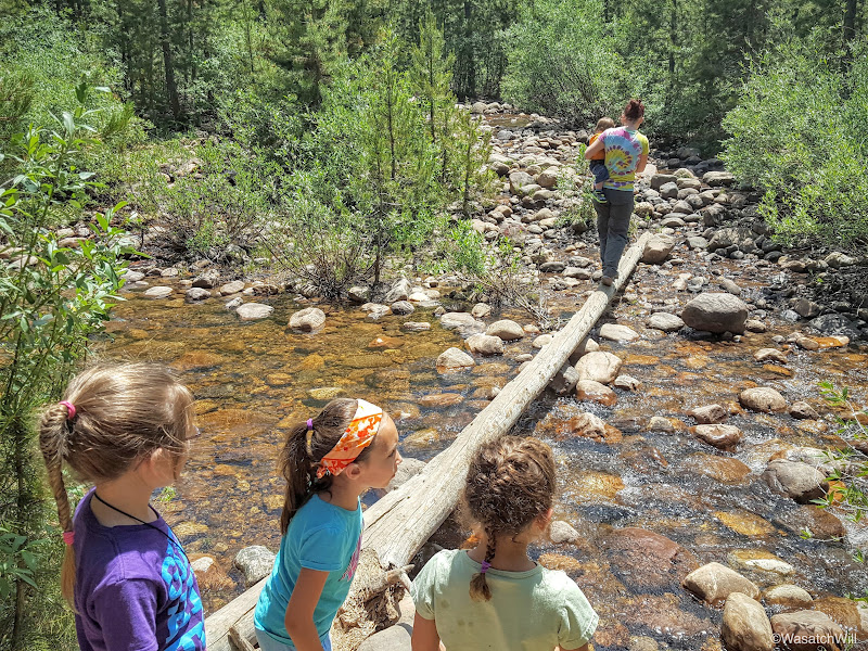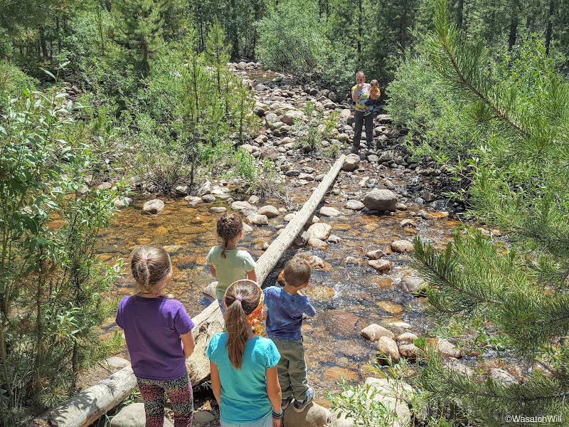 With no argument from me, we loaded up the car and off we went. Along the way, we'd make a stop at the famous Fairy Forest off the Mirror Lake Highway. To get to it, we'd have to cross through a campground and then cross over a branch of the Provo River. Later in the year the stream bed will be more of a trickling stream making a dry crossing much easier with more rocks exposed. With a good snow year this past winter though, the water level was still flowing relatively high for this spot. Fortunately, there was a long dry log to serve as a bridge.