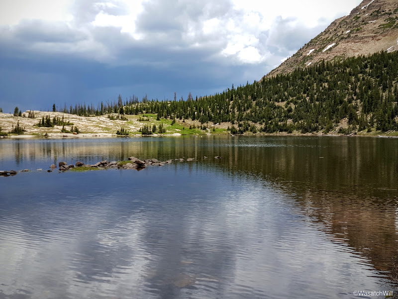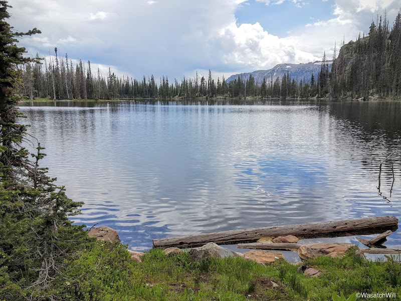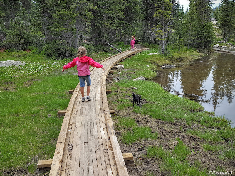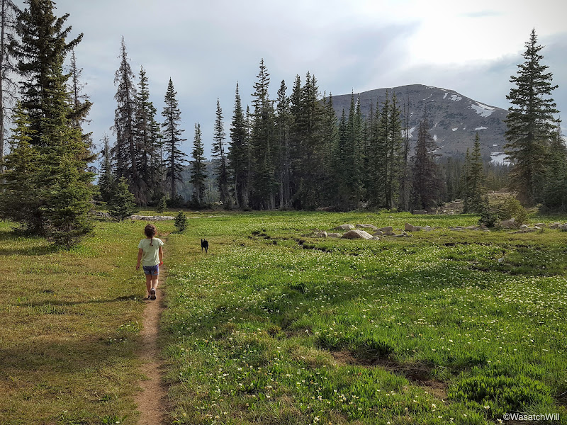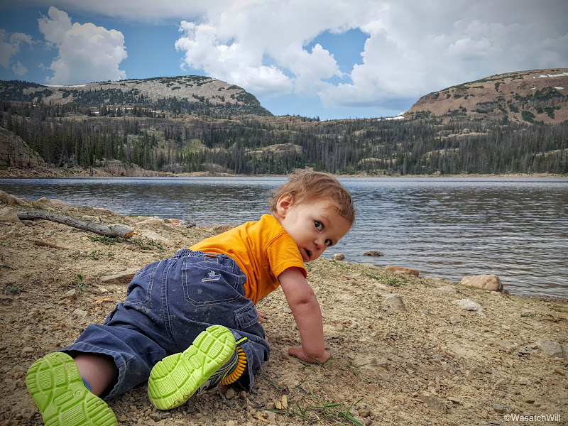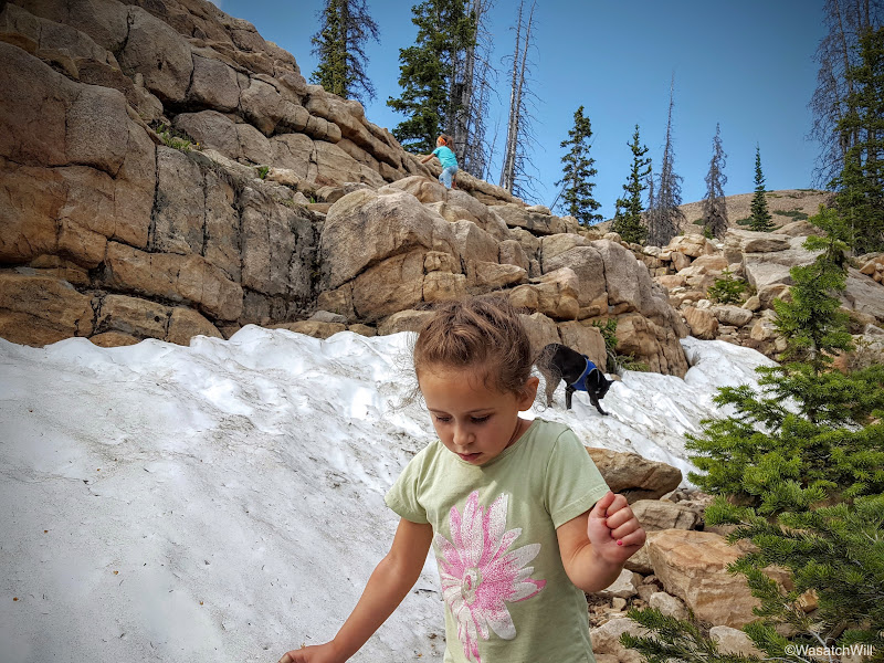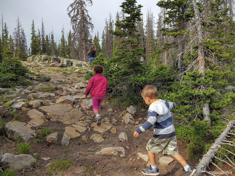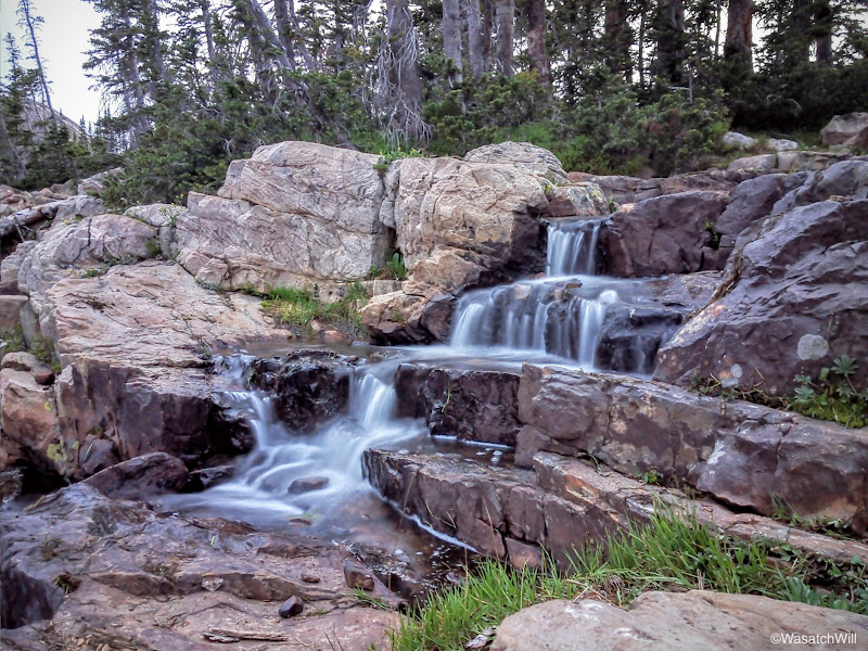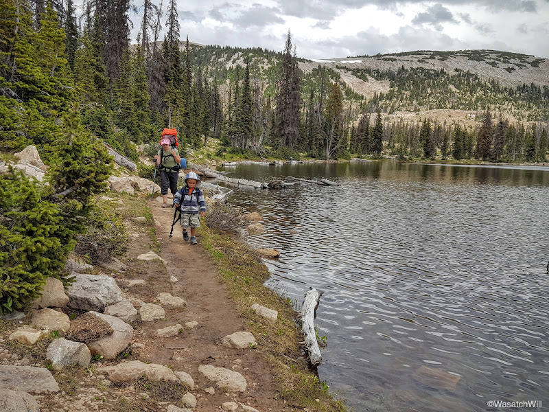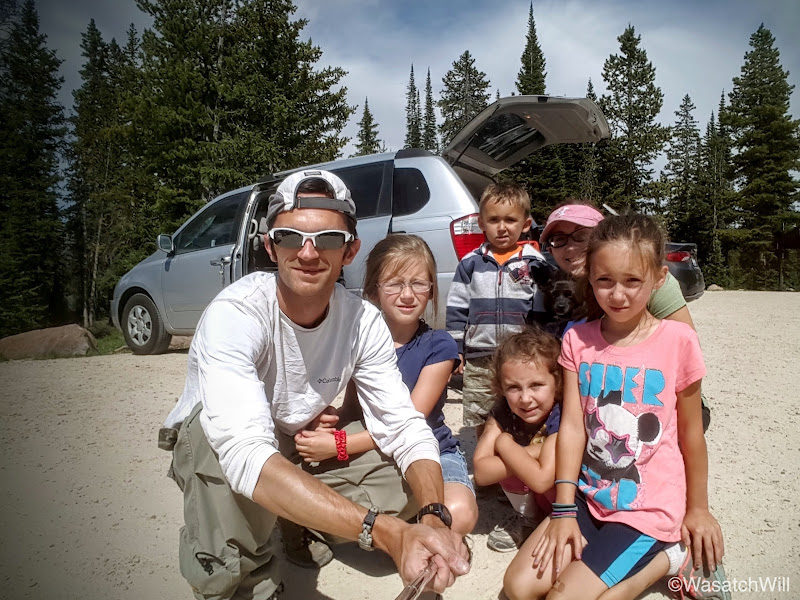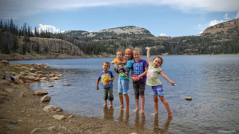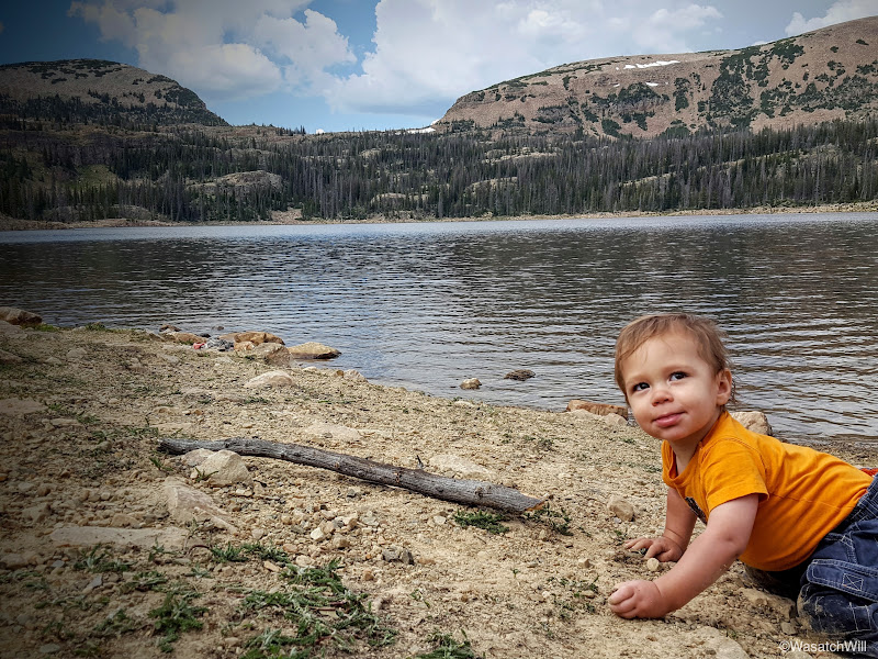 After about a mile of a roller coaster trail, we arrived at the edge of Wall Lake. It's always neat to see the headwaters for the Provo River flowing out of Wall Lake. Not only because of a beautiful little cascading waterfall that begins the river, but because we live in Provo, where the river finishes it's journey as it feeds into Utah Lake.