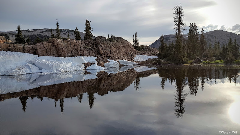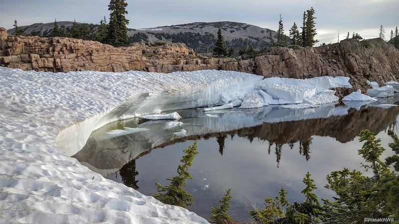While I would have enjoyed soaking in the views for a little while longer, I had accomplished my goal and now desired to get back down to my family and minimize the time away from them. So on down I went. This time, I'd return around the other side of Clyde Lake, exploring some of the terrain along the way. I paid a quick little detour visit to a lake with no official name on any maps but at least one person has called it "Cave Lake" on their site. It featured one side still covered in snow and ice, making it look like a mini glacier.
