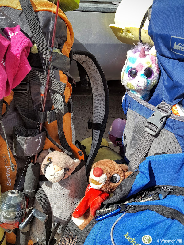 After we had our fill of fairies, we got back in the car where lunch was dished up and drove a few minutes more up the road to reach the trailhead. There we geared up and got ready to go, pack buddies and all.
