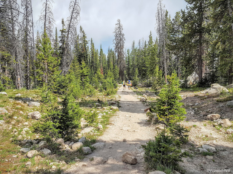 During our break, a group of 15 scouts and their 3 leaders rolled in with fishing gear and began to set up nearby. A few other backpackers, a couple with their dog and another lady with her dog had also passed us up as they appeared to be hiking on above Wall Lake as well.
