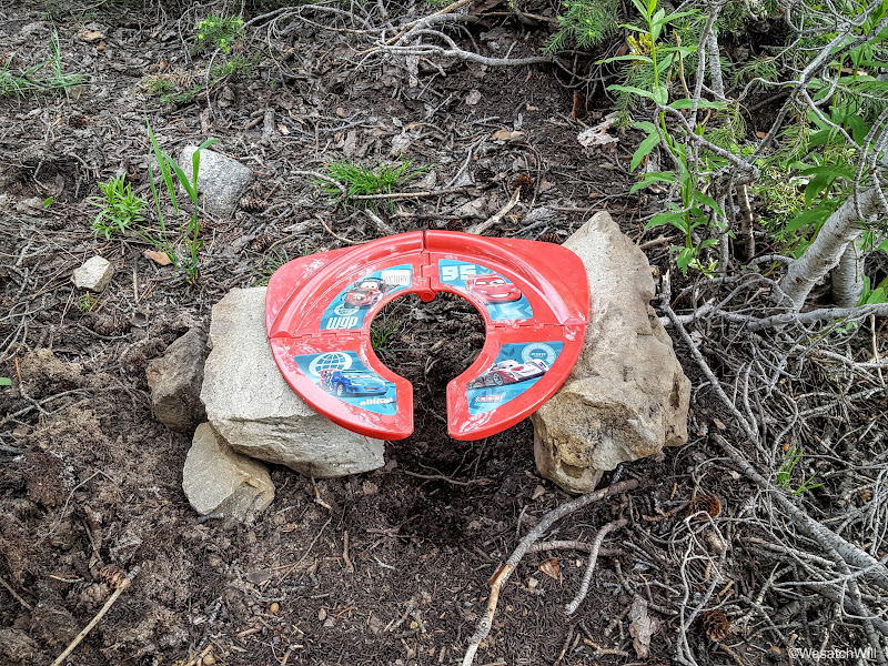 Some may wonder how the bathroom thing works with all the young kids. Well, here's one of our secrets. We have a lightweight foldable potty seat that can easily be set over a hole dug out between 2 to 3 rocks. It makes a convenient little latrine.